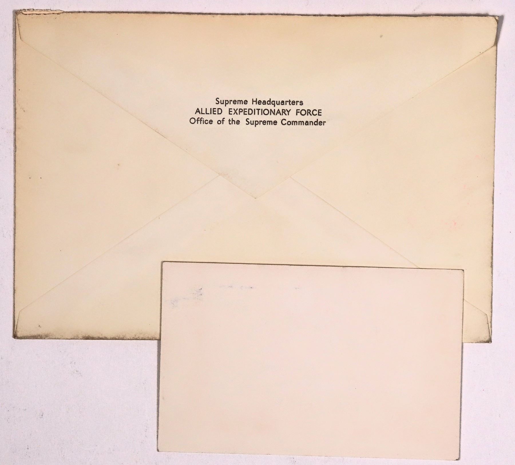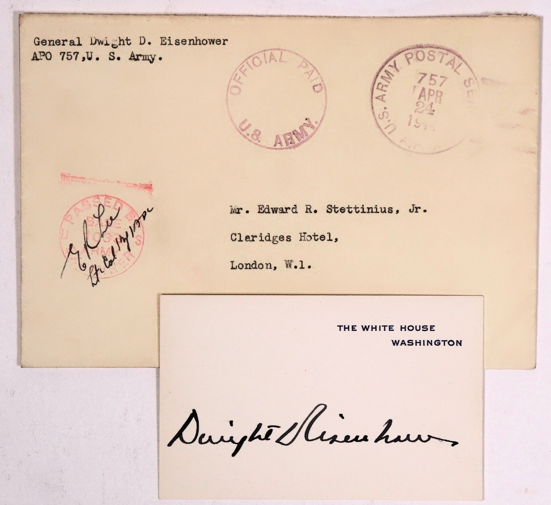 Lot of 2. Dwight David "Ike" Eisenhower was an American military officer and statesman who served as the 34th president from 1953 to 1961. During World War II, he served as Supreme Commander of the Allied Expeditionary Force in Europe and achieved the five-star rank as General of the Army. 1) Autographed card from when he was president. Printed "The White House Washington." Bold signature in black pen. 2.5 x 4" 2) Postal cover from April 1944. Corner printed with General Dwight D. Eisenhower, APO 757, U.S. Army. Sent to Edward R. Stettinius Jr. at the Claridges Hotel in London. Military cancels. No contents. Stettinius was Secretary of State at the time. What World War II secrets could this have held?