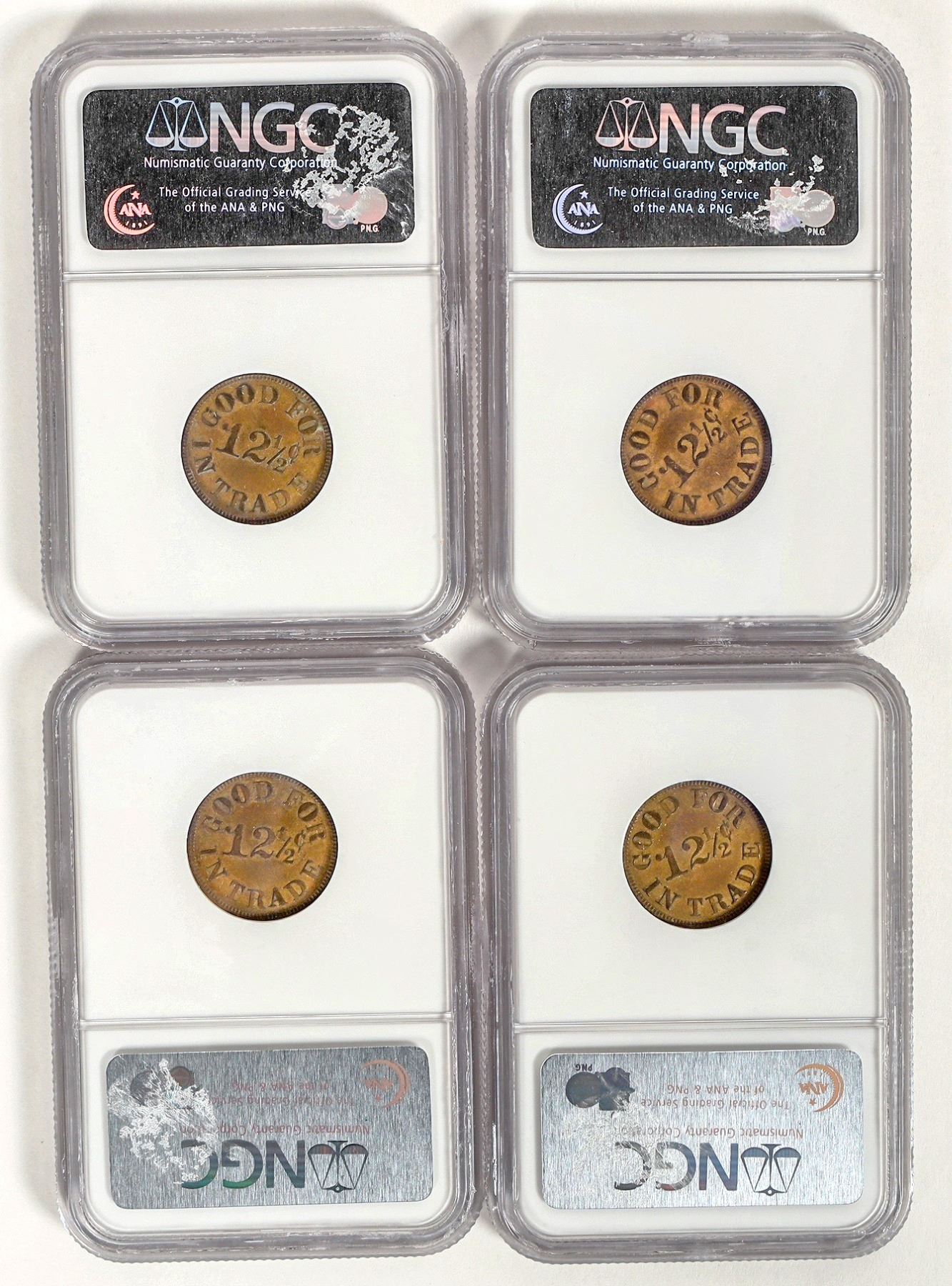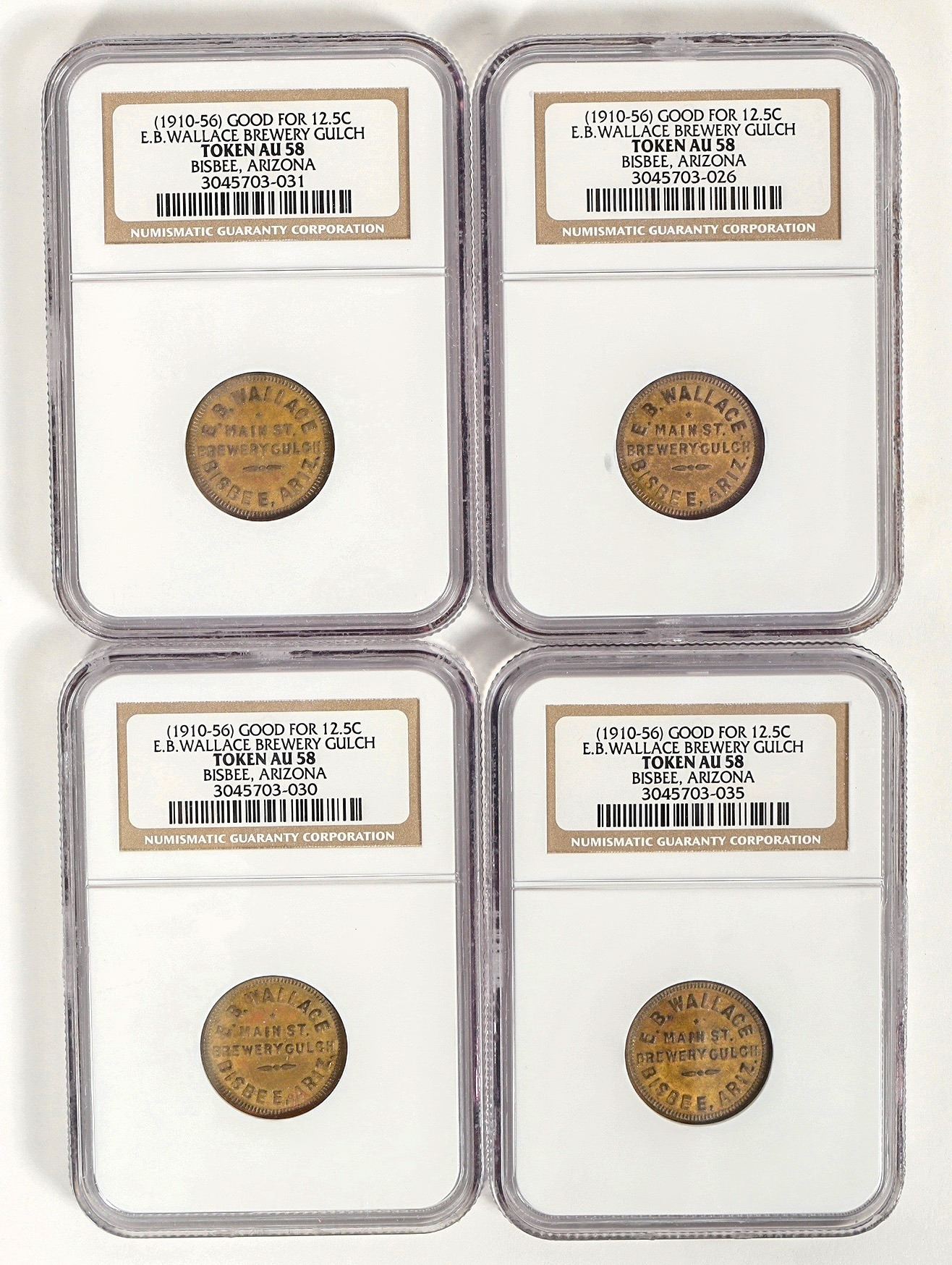 Lot of four NGC certified AU 58 tokens: E.B. WALLACE / MAIN ST. / BREWERY GULCH / BISBEE, ARIZ. // GOOD FOR / 12Ω¢ / IN TRADE; Br. rd., 21 mm. The historical marker in Bisbee says this: "In the early 1900's the rough edges of Bisbee's mining camps could be found here in notorious Brewery Gulch with its dozens of saloons, gambling halls and crib houses. The street got its name from a common activity in Bisbee's early days, represented by Muheim's Brewery building, which still stands today. The "Gulch" was also the location of the Bisbee Stock Exchange, making it the center of activity in more ways than one. One of the popular spots was St. Elmo Bar, the oldest bar in Bisbee, which is still in business to this day."