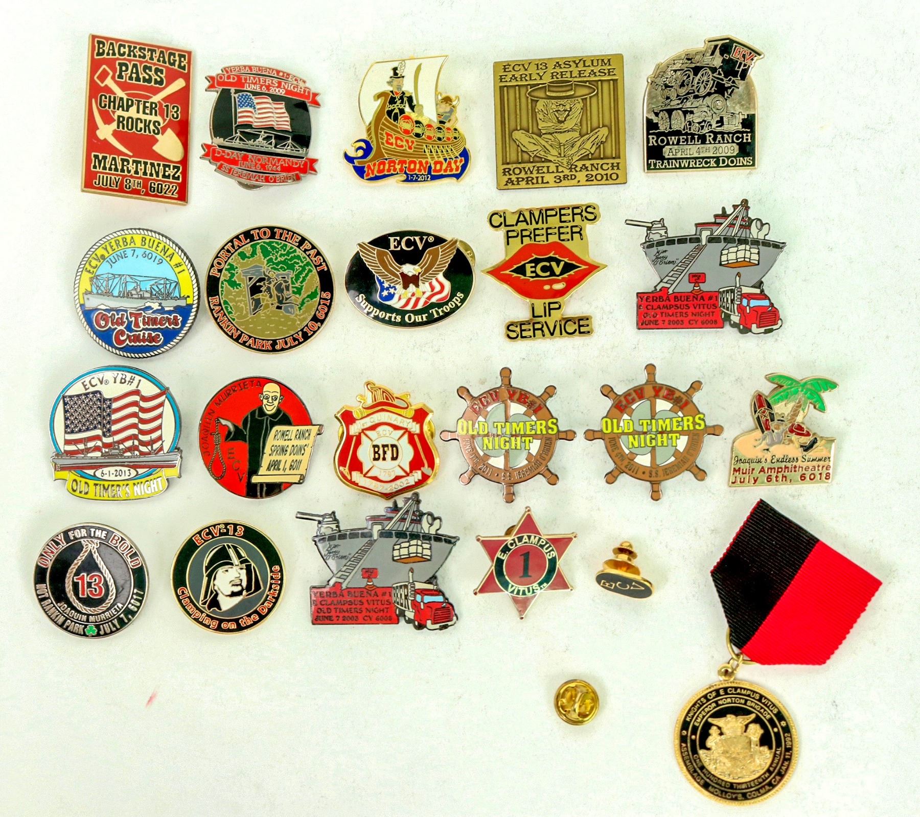 Lot of 22. E. Clampus Vitas fraternal organization dedicated to the preservation of Western United States history, especially the Mother Lode and gold mining areas. These pins are from chapters: Yerba Buena #1, Joaquin Murrieta #13. Shapes: ships helm, fireman's hat, cargo ships and more. Excellent cond.