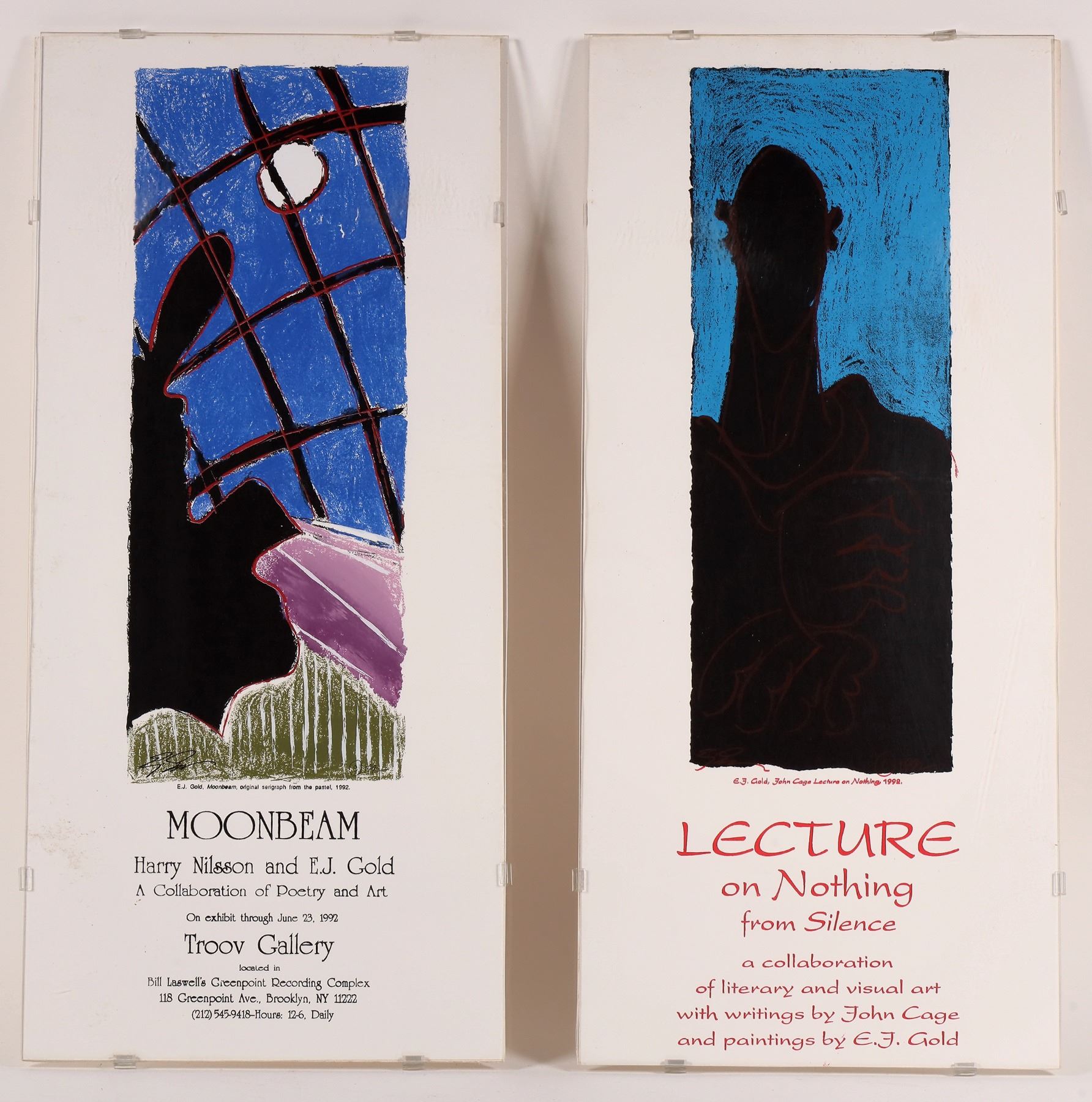 2 EJ Gold, Harry Nilsson, John Cage and Bill Laswell music and art related prints. Moonbeam and Lecture on Nothing. 22x10", both sandwiched in acrylic.