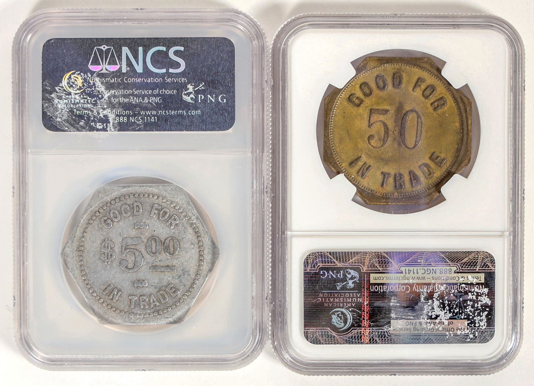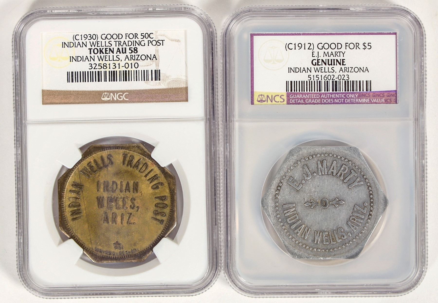 Lot of two certified tokens from Navajo County: 1) INDIAN WELLS TRADING POST / INDIAN / WELLS, / ARIZ. / L.A. RUB. STP. CO. // GOOD FOR / 50 / IN TRADE; Br., octagonal, 35 mm; AU 58 (NGC). 2) E.J. MARTY / INDIAN WELLS, ARIZ. // GOOD FOR / $5.00 / IN TRADE; Al., hex., 33 mm; Genuine (NCS). (He was in business from sometime before 1911 until at least 1929.