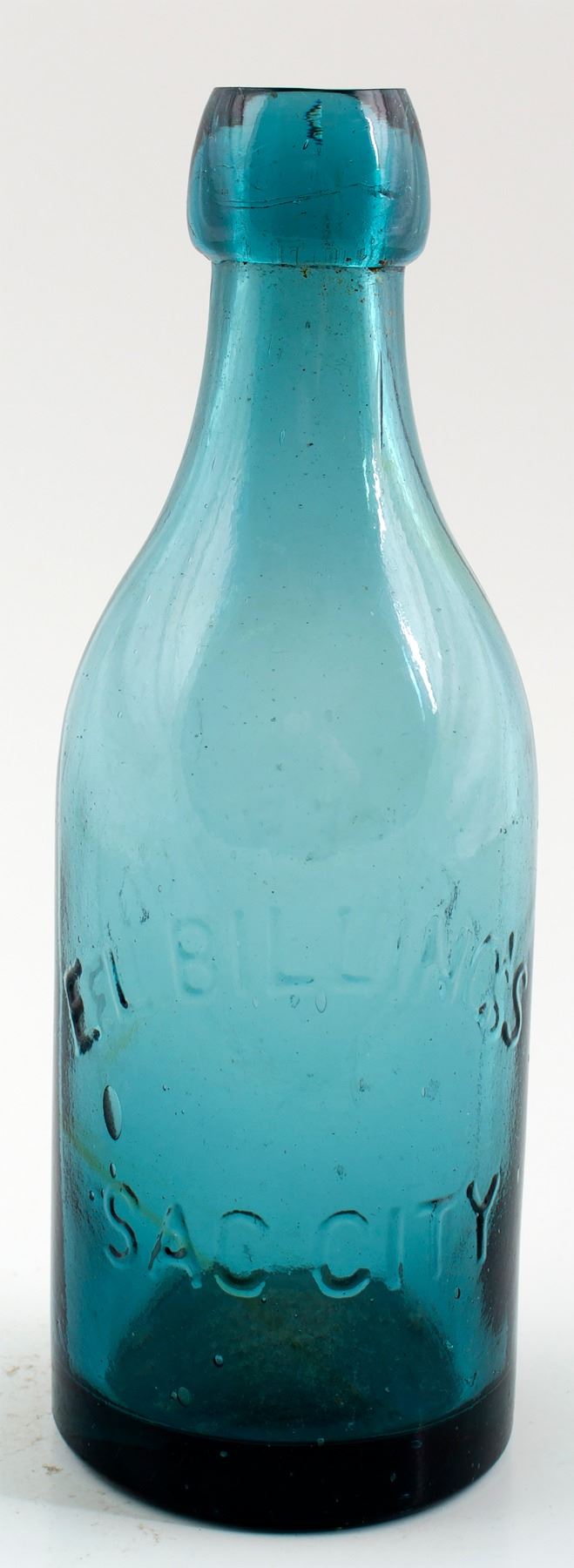 Geyser Soda ( au ) / Reverse: E. L Billings (au) / Sac City // Light teal blue. Clean and shiny. Has a 3/8" inside lip bruise. Otherwise , a nice bottle with an olive swirl in it, towards the base.(RH).Fred Holabird Collection