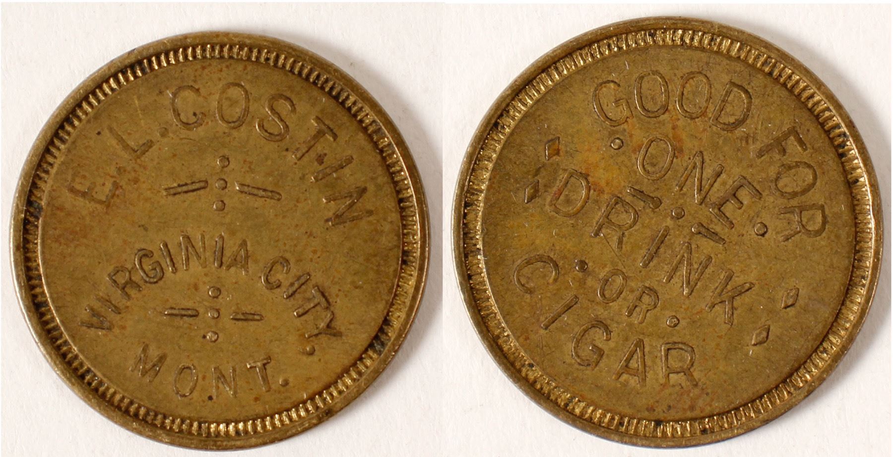 R8, embossed with the name of E.L. Costin, reads on back "good for one drink or one cigar" Date: Location: Virginia City, Montana HWAC# 57519