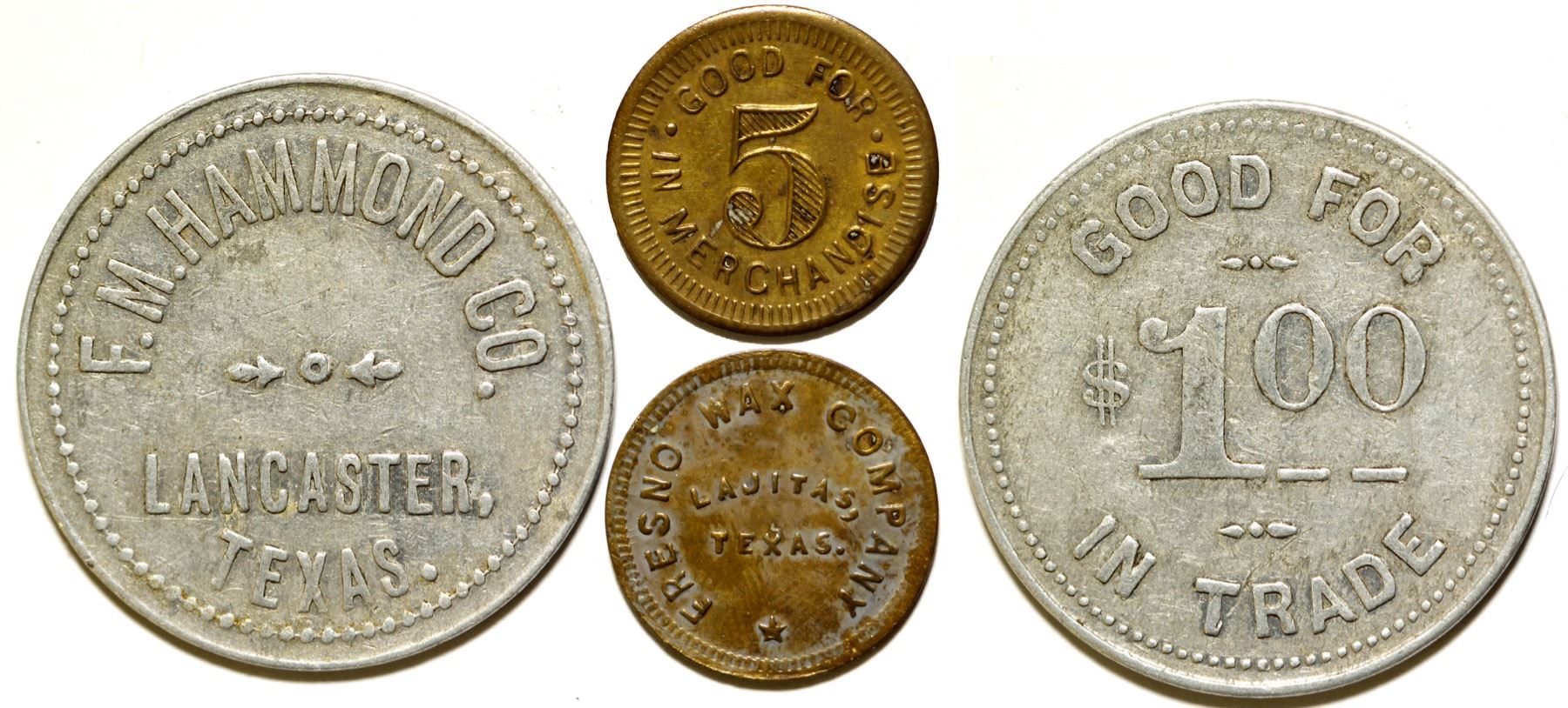 Lot of two: 1) Obv.: E.M. Hammond co. / Lancaster, / Texas; Rev.: Good For/ $1.00 / In Trade. Wm, rd., 33 mm. 2) Obv.: Fresno Wax Company / Lajitas / Texas; Rev.: Good For / 5c / In Merchandise. Br., rd., 20 mm. State: Texas City: Lajitas/Lancaster Date: HWAC# 81464