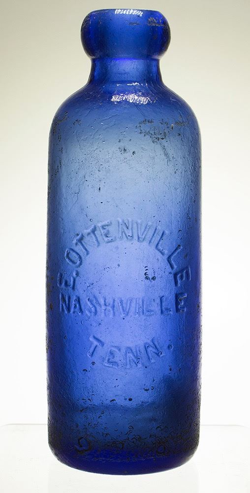 E. Ottenville. Cobalt blue Hutch soda bottle soda. Tooled top. Never professionally cleaned, some surface stain and wear. Should clean up to be a beauty. Date: Location: Nashville, Tennessee HWAC# 47019