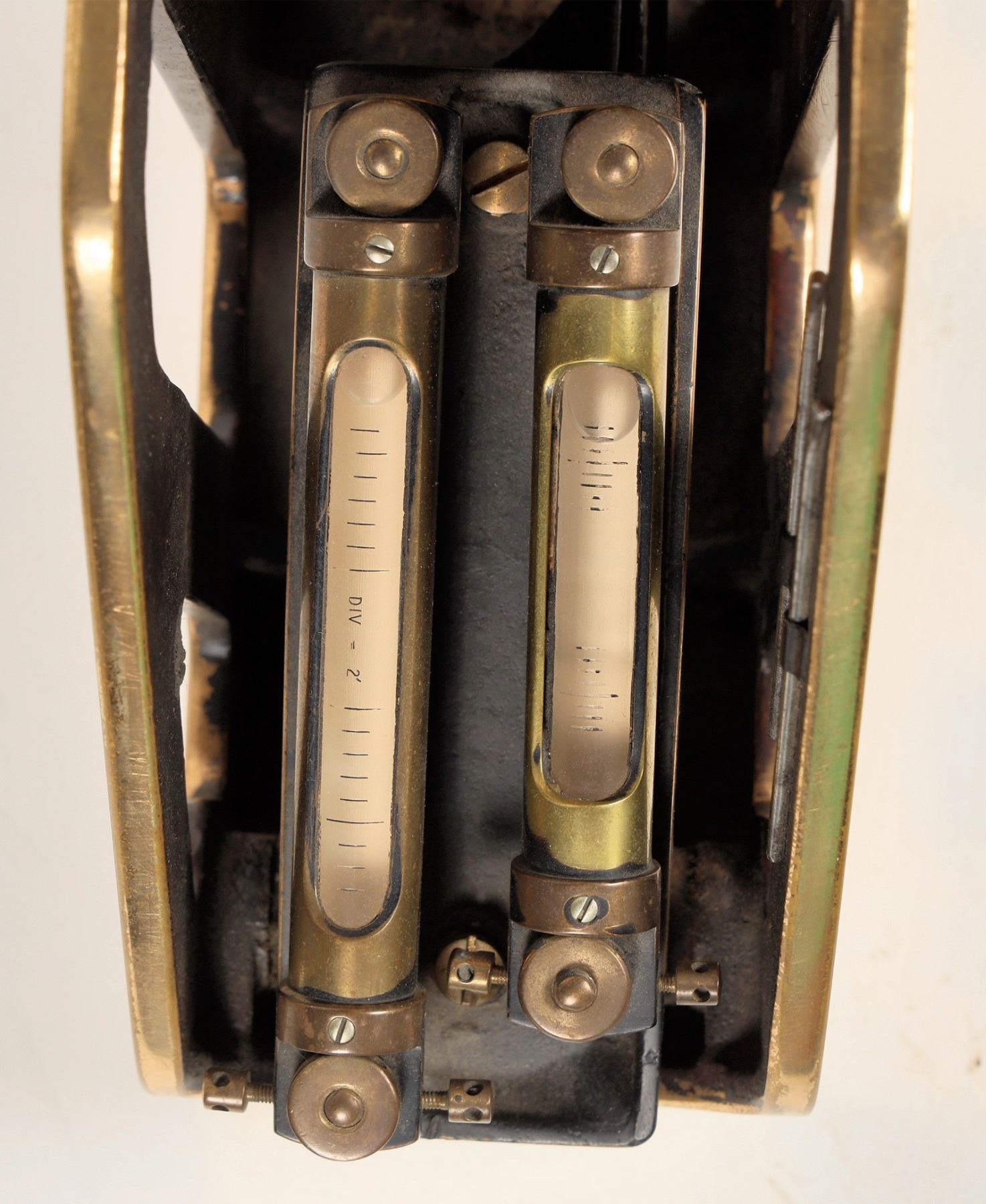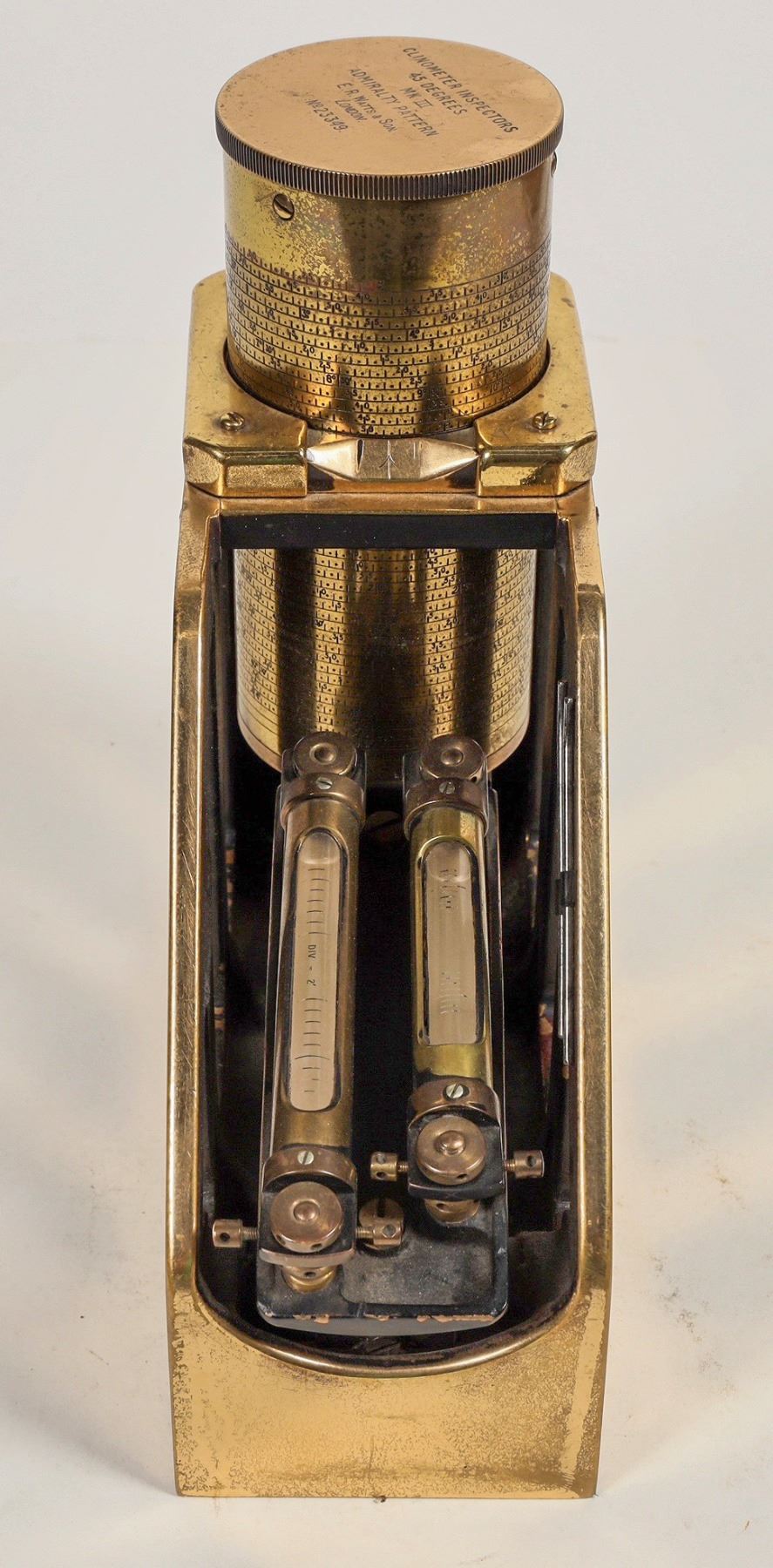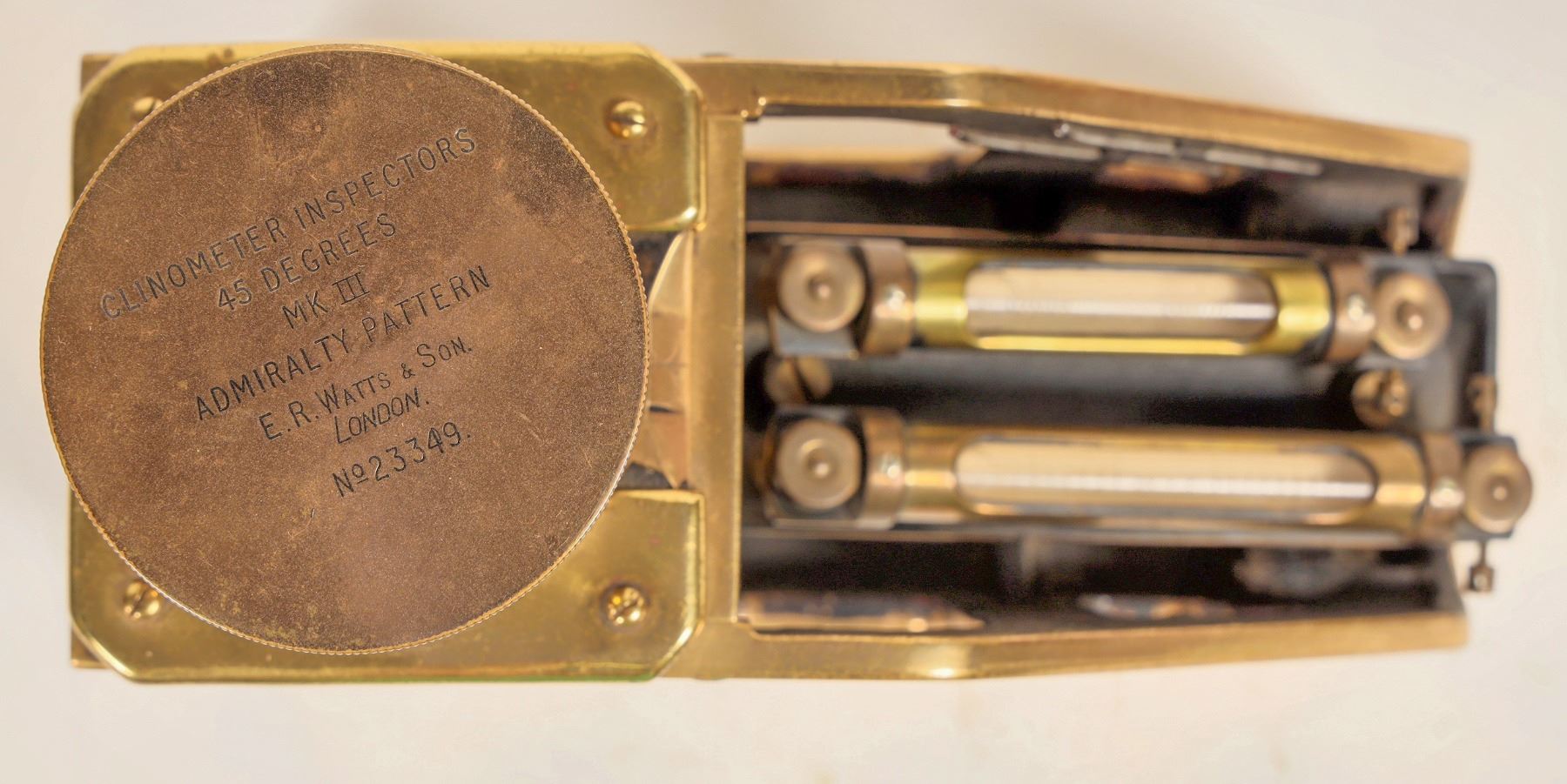 This is an artillery Clinometer Admiralty Pattern built by E.R. Watts of London dated 1942 with mahogany case S/N 23349. This piece would have been used by artillery likely in a naval application during WW2. In excellent condition with three accessories, mahany case, green velvet and original leather carry strap. Please see photos for details.