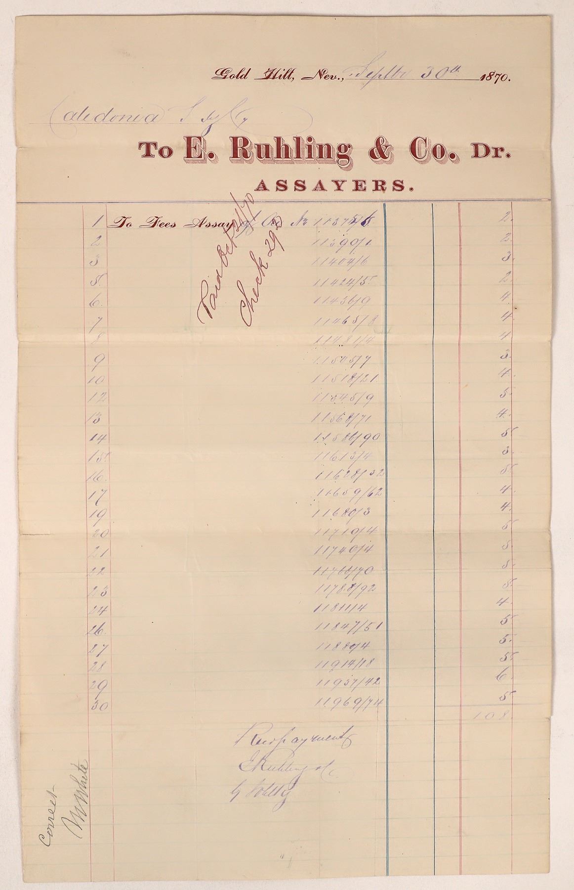 Extremely rare. Dateline Gold Hill, Nev., Sept. 30th, 1870. Billed to Caledonia Silver Mining Company for several assay fees. Red print, larger format billhead. 8.5 x 14" Deep folds. The Caledonia Mine was located south of the Overman Pit approx. 0.5 mile southwest of Gold Hill. It was formed from a consolidation of seven claims in 1861 and was 2,188 ft. on the Comstock Lode. In the 1860s, John Mackay served as one of its superintendents. [Ref: Ansari] E. Ruhling was an assayer and banker in San Francisco, California, & Virginia City, Gold Hill and Hamilton, Nevada. Ruhling was born in Hamburg, Germany and began to establish himself in San Francisco around 1858. By 1861, he was working and residing in Nevada. His business partner in 1862 was H.V.S. McCullough in the firm of Ed Ruhling & Co Bankers and Assayers in Virginia, Nevada Territory. In 1869, Ruhling operated an assay office at the new silver mining camp of Hamilton in eastern Nevada. Ruhling's business was bought out by McCullough in March, 1871. He returned to San Francisco working as an assayer and joined the Assay Department at the San Francisco Mint by 1878. Ruhling died in San Francisco at the age of 66 in 1898. The Ruhling Assay Office was given the order for making the last (gold) spike for the transcontinental railroad; the original is located at Stanford University.