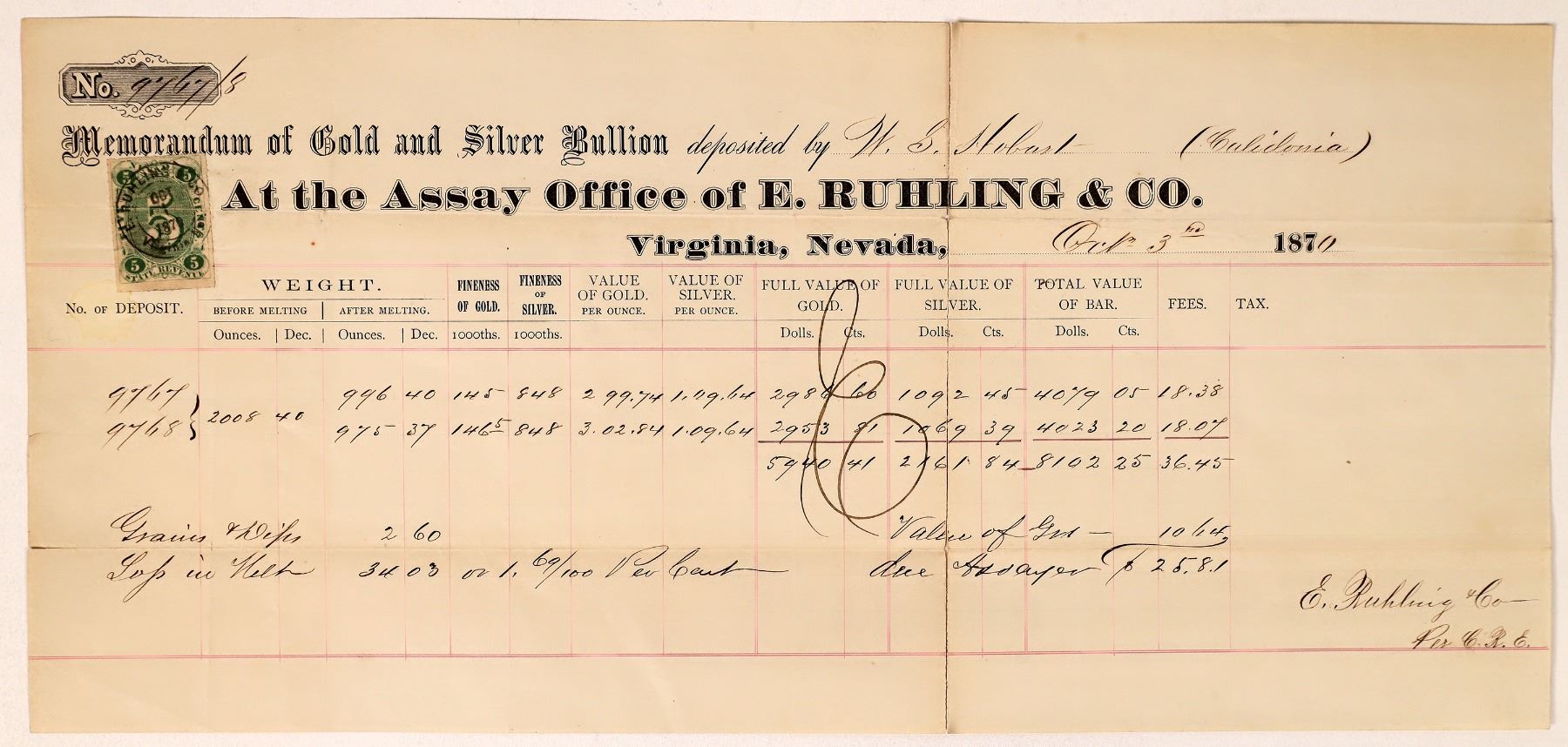 Ruhling memorandums are rare, but this one is even more special since it is for a deposit by WS Hobart for the Caledonia Mining Company. Hobart was heavily involved with numerous logging operations at Lake Tahoe that fed the Comstock's need for lumber, including the Sierra Nevada Wood & Lumber Co. (which eventually relocated from Crystal Bay at Tahoe to Hobart Mills near Truckee), the Virginia & Gold Hill Water Co., and numerous mining projects. This memorandum, dated Oct. 3rd, 1870, is for two deposits, 2008 ounces total, .848 fineness silver. Each bar valued at a little over $4,000. Signed in the corner E. Ruhling & Co. per CRE. 5 cent green Nevada adhesive revenue stamp attached at upper left. 6.5 x 14" Deep folds. The Caledonia Mine was located about 0.5 mile southwest of Gold Hill. It was formed from ca consolidation of 7 claims in 1861. In the 1860s, John Mackay was superintendent.