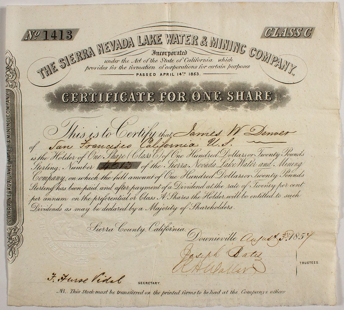 GOLD RUSH! #1414 for one share to James W. Denver. English style stock certificate. Signed by Joseph Bates and R. H. Walters. Denver was an American politician and lawyer. He served in the California State Government, was an officer in the United States Army, served in the United States Senate, and was Governor of the Kansas Territory during the struggle over whether or not Kansas would be open to slavery. The town of Denver, Colorado is named for him.City: DownievilleCounty: SierraState: CADate: 1854