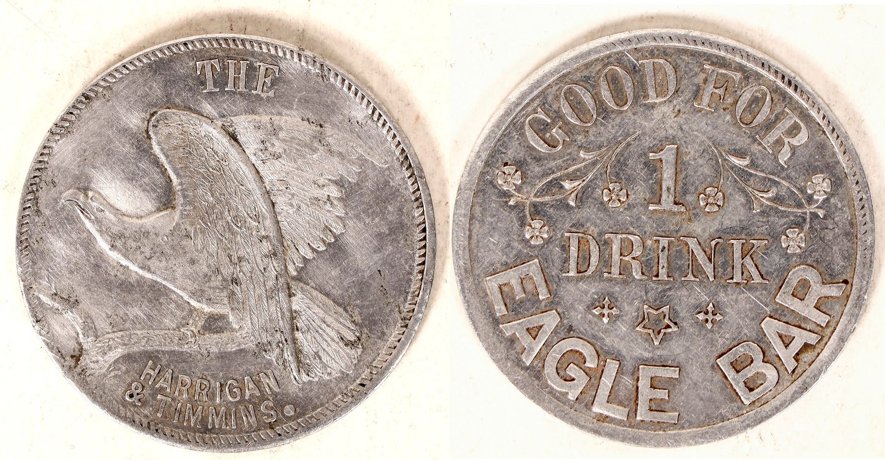Rare pictorial token! GOOD FOR 1 DRINK EAGLE BAR / THE / (pictorial eagle) / HARRIGAN & TIMMINS; Wm, rd., 35 mm. Token catalog has the mirror listed, but not the token. [Fresno] [California]