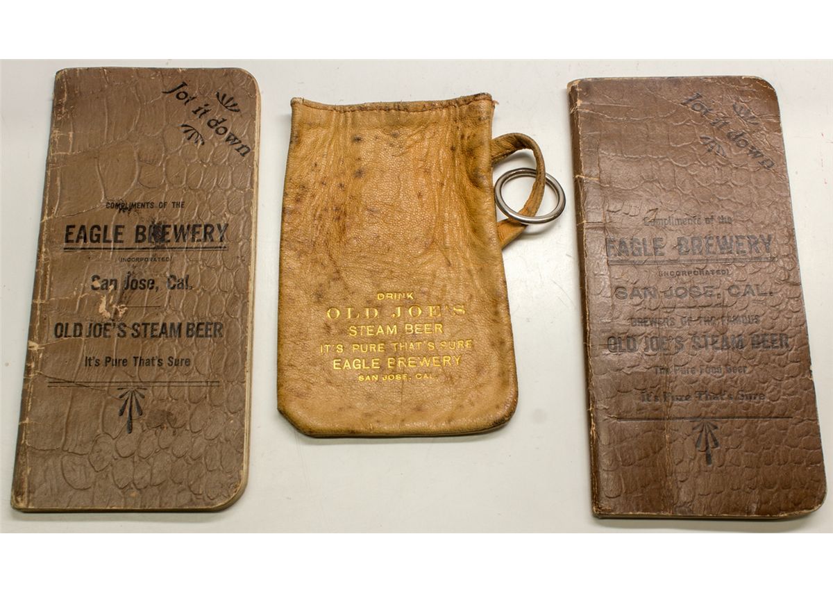 1) Coin purse with key ring. "Dink Old Joe's Steam Beer / It's Pure That's Sure / Eagle Brewery / San Jose. 2-3) Two notebooks. "Old Joe's Steam Beer." Notebooks are generally unused, but have some pencil notations.