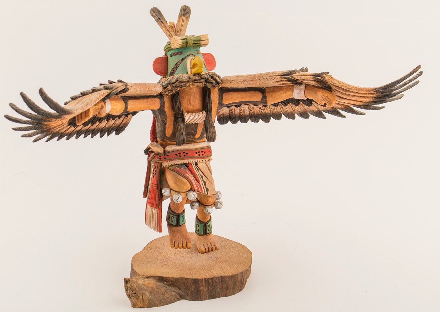 Eagle Dancer Kachina by Henry Naha. 9" x 13.5" x 5". One feather on headdress is missing. Henry Naha was born in 1964 in Moenkopi (Third Mesa) and began carving in the 1980s. He is a well known carver who specializes in detailed carvings. He is of the Spider and Lizard clans, and signs his dolls with his clan hallmark followed by "H. Naha." His Navajo last name is Attakai, but he takes the name of Naha as a result of his Hopi adoption and cultural heritage. His figures always have an excellent stance and pose...which suggest great strength and pride. The body proportions are right on, and the figure has well-defined musculature. The hands are extremely well carved with detailed fingers and fingernails. Henry's favorite carvings are the Velvet Shirt and the Red Tail Hawk. Date: Location: Hopi, Arizona HWAC # 52137