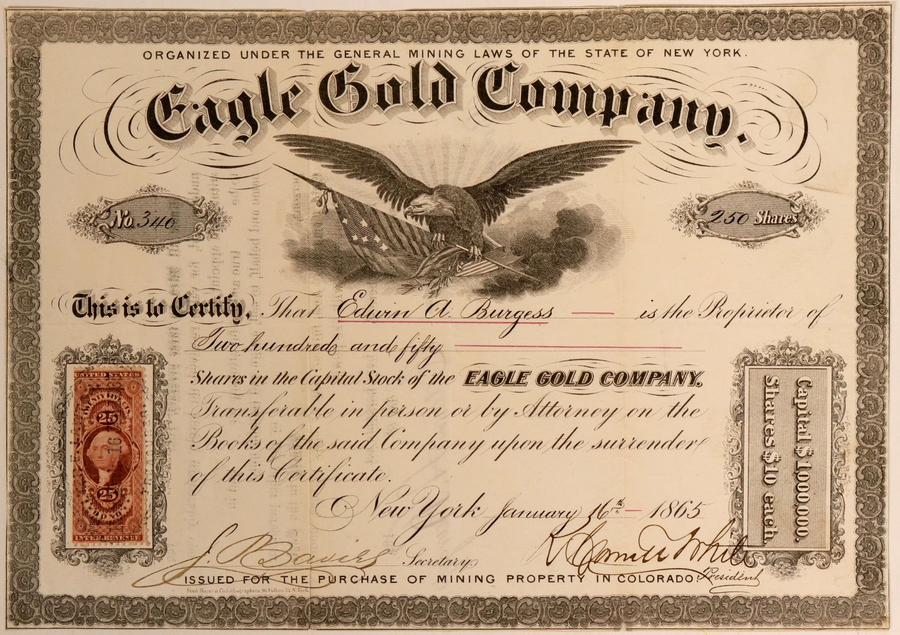 Black Hawk, CO. Computer sorted it out of place. Incorp New York. Extremely rare. #340, I/U, 250 shares issued Jan 16, 1865. Signed R. Emmett White President. Black. Vignette top eagle wings spread holding American Flag, left 25 cent revenue stamp. Ferd Mayer & Co printer. Signed on reverse by Burgess. Corporate officers in 1864 received a salary of $35,000, causing a problem for the company. In 1866 the officers were replaced. Vf