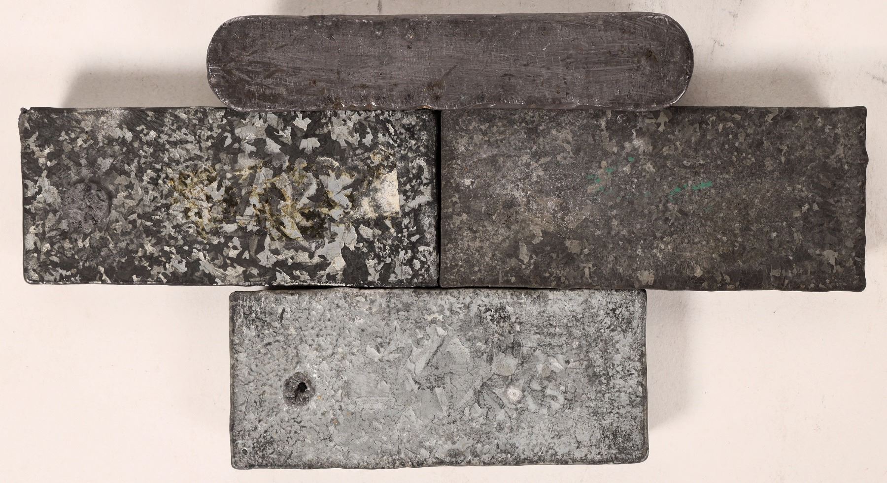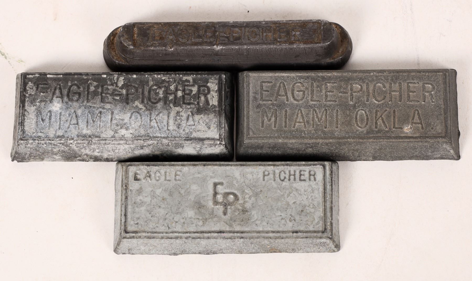 Lot of four lead ingots from Miami Oklahoma: 1) Eagle Picher; 3 x 1/2 x 1/2 inches; 143.7 grams; 2) Eagle Picher / Miami - Okla; 2 3/4 x 1 x 1/2 inches; 125 grams. 3) Eagle Picher / EP; 2 3/4 x 1 x 1/2 inch; 119 grams. 4) Eagle Picher / Miami Okla; 2 3/4 x 1 x 1/2 inch; 126.3 grams. "In 1906, the Picher Lead Company of Missouri merged with Eagle White Lead to form Eagle-Picher Lead. Eagle-Picher, starting with Picher Lead Company, operated lead and zinc extraction facilities in the Tri-State mining district of southwest Missouri, southeast Kansas and northeast Oklahoma. Picher, Oklahoma was named for O.S. Picher, the original owner of Picher Lead Company, and large-scale mining started there in 1913. The area became the most productive lead-zinc mining field in the district, producing over $20 billion worth of ore between 1917 and 1947. More than fifty percent of the lead and zinc metals used during World War I were produced around Picher"--Wikipedia. Oklahoma Miami