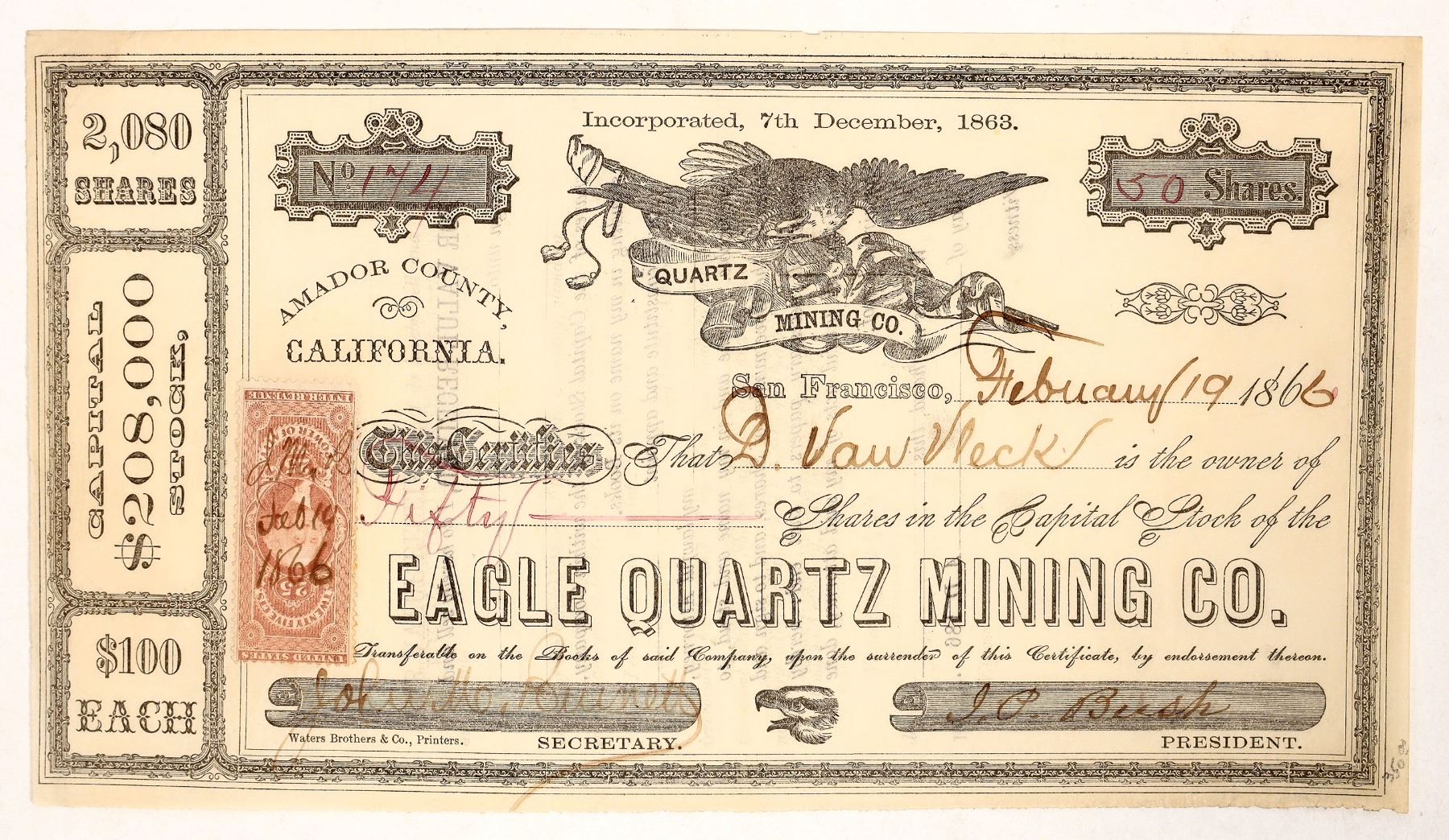 Amador County, California (printed at left). Inc. Dec. 7th, 1863. No. 174, issued for 50 shares to D. Van Vleck (an artist and lithographer) on Feb. 19th, 1866 in San Francisco. Signed by president JP Bush and secretary John Burnett. Not cancelled. Black border and print. Two eagle vignettes. Printed by Waters Brothers & Co., printers. 25 cent adhesive revenue stamp attached at left. Folds, light wear. 5.5 x 9.5" Jonathan P. Bush is listed as a physician in the 1867 SF Directory. John Burnett is listed as an attorney. No additional information could be located about this company.
