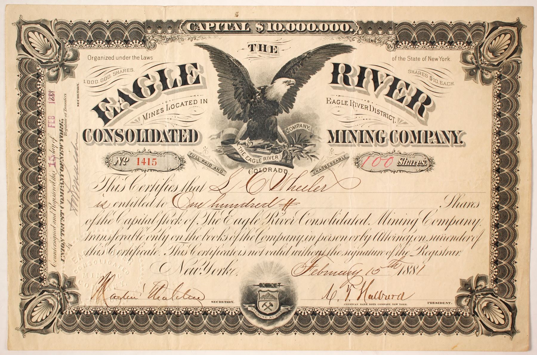 # 1415 fir 100 shares to SC Wheeler. Signed by Marten Wealtur(?) and president C T Halburd. Dateline New York 1881. Incorporated 1880. "Mines locate in Eagle River District." Not cancelled. Large Eagle vignette. American Bank Note printer. Pin holes. Very small edge issues. Overall quite excellent. The rush for western Colorado was soon in coming. The San Juans had already been invaded by miners and now it was west-central Colorado's turn. In the mid-1 870s the upper Eagle River valley was settled. Redcliffe, Holy Cross City, and other towns were founded. By 1879, the Aspen region was under development and precious metal mining was established in the high country. Coal mining also developed in the early 1880s to fuel the smelters and towns that arose from silver extraction efforts. ["The Valley of opportunity : a history of West-Central Colorado" by Mehls] Eagle RIver is near Redcliff. Prag Collection State: Colorado City: Eagle River Date: 1881 HWAC# 85236