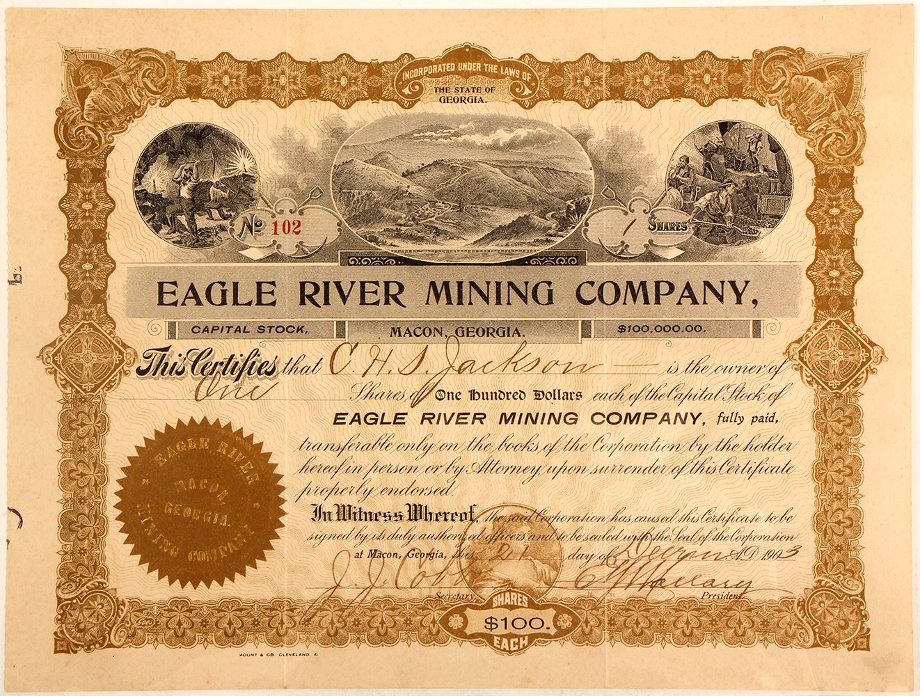 Number 102 for 1 share to CHS Jackson in 1903. Early. Signed by secretary JJ Cobb and president EY Mallary. Two dark marks on left border. Vertical folds are heavy, but no rips or tears. Otherwise, no other condition issues. Incorporated in Macon, Georgia in Includes three vignettes: two underground mining and one country scene. The Eagle River Mining Company was a hard rock gold mining enterprise operating in Eagle River, Alaska, with its main office in Macon, Georgia. Officers of the company were: President E. Y. Mallory, Vice President E. J. Willingham, Second Vice President and resident representative C. D. Mallary, Superintendent B. L. Thane, and Assistant Superintendent J. R. Whipple. [University of Alaska Anchorage Consortium Library] Around this time, the Daily Alaska Dispatch stated, gThe ore at the Eagle River property is said to be the richest in Alaska.h When the mine started up, Paddy OfNeil became the mine foreman. He hired 25 men to work inside the mine and another 25 for the mill and support buildings. [thealaskalife.com; Uncovering Amalga] (Al Adams Gold Rush Memorabilia Collection) HWAC# 56962 Date: 1903 Location: Eagle River, Alaska