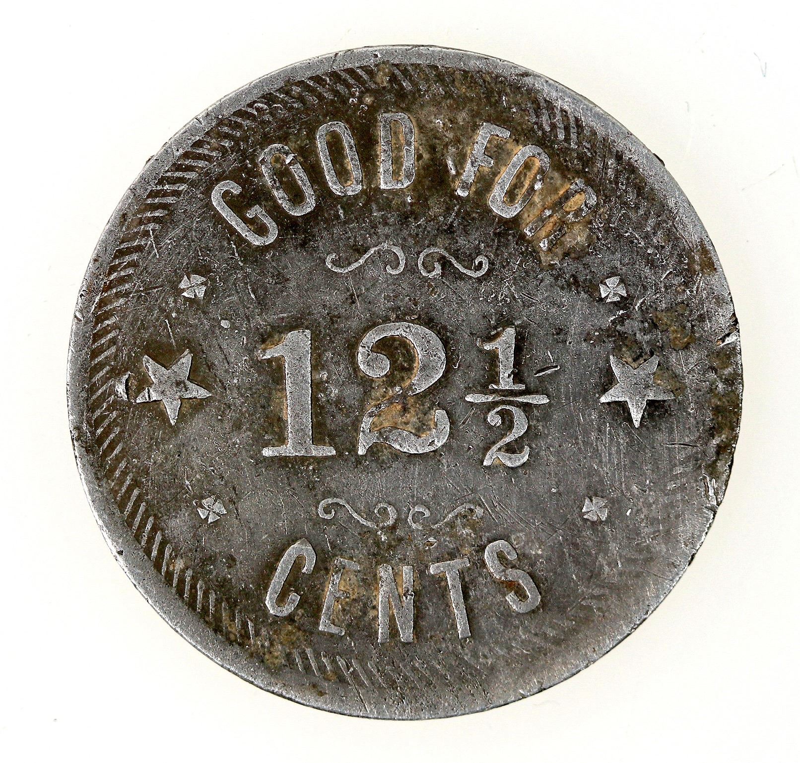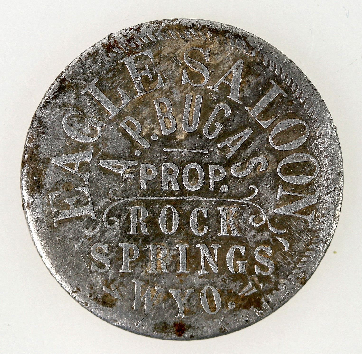 EAGLE SALOON / A.P. BUGAS / PROP. / ROCK / SPRINGS / WYO. //GOOD FOR / 121/2 / CENTS. Round, aluminum, 27mm. Very rare. TC-279555; Bowker RK352