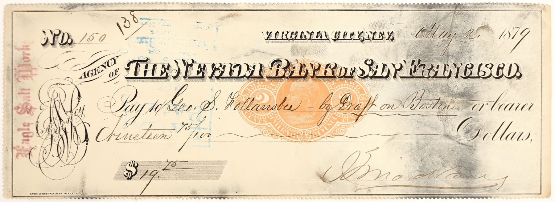 Very rare. All known checks have the soiling issues this check has. Stamped Eagle Salt Works in violet at left. Issued in 1879. Signed by Bonanza King mining millionaire John Mackay. RN-F imprinted revenue. The Eagle Salt Works deposits were discovered in 1869 by B.F. Leete in Churchill County, Nevada, 15 miles east of Wadsworth. Salt was an important component in the milling process of Comstock ores.