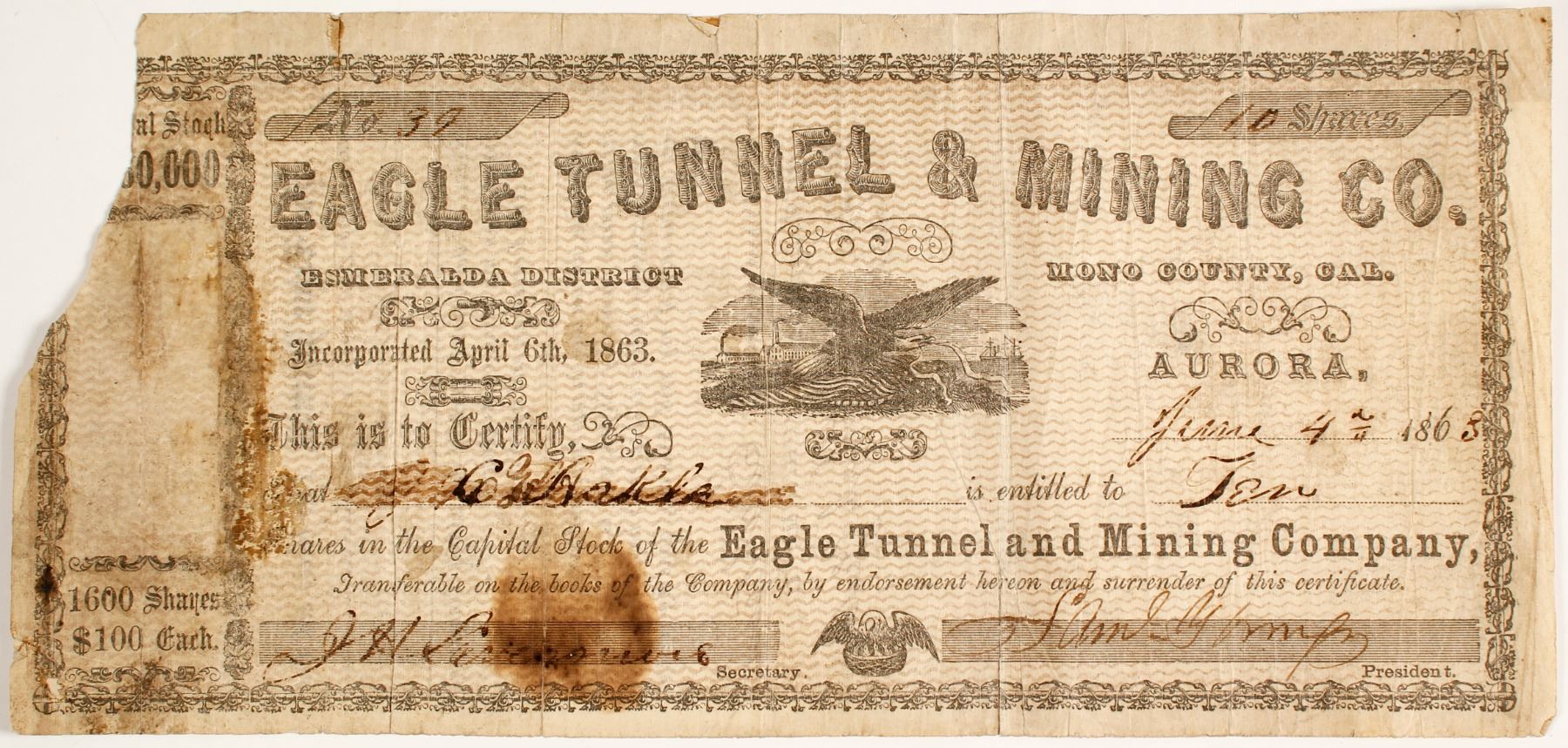 The Eagle Tunnel & Mining Co. was located in Aurora, Mono County, California. It was established in the early 1860s after the discovery of gold deposits in the area. Mono County included the Bodie Mining District which was one of the richest deposits in the area. Aurora, established in 1860, was for a time simultaneously the county seat of Mono County, California and Esmeralda County, Nevada before an official survey by the federal government determined Aurora was actually located in Nevada. A new county, Mineral, was created in 1911 that included Aurora. Little is known about the Eagle Tunnel & Mining Co. except that it was established in Mono County and incorporated in Aurora before the official survey was conducted. [ http://mineralcountynv.us/index.php/component/content/article/46-welcome-to-mineral-county] Prag Collection State: Nevada City: Aurora Date: 1863 HWAC# 82012