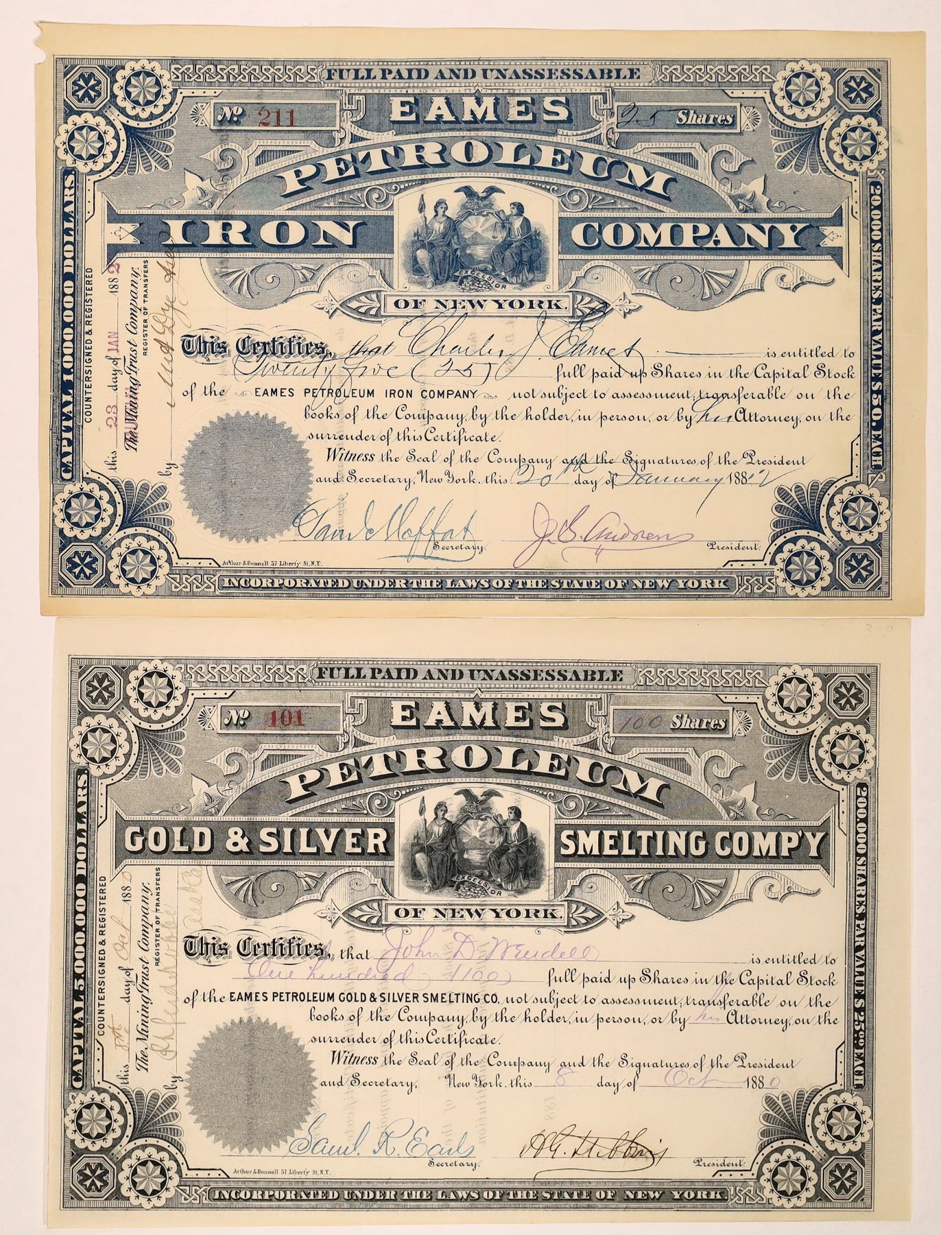 A pair of stock certificates issued by Eames Petroleum Iron Company and Eames Petroleum Gold & Silver Smelting Company.