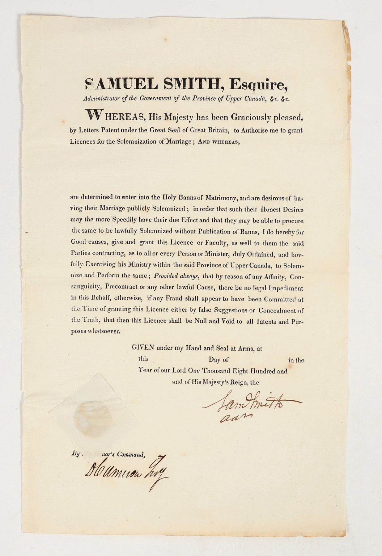 Early marriage license dateline 18__, Signed by Sam Smith, license was never issued. Samuel Smith, Administrator of Government , Province of Upper Canada- Now Ontario Canada.In addition to this license the bridegroom had to enter into a bond of 200 pounds with the Crown. Sam Smith was an army officer, politician and colonial administrator. He served as Administrator twice from June 1817-Aug, 1818. and again March 8 -June 30, 1820