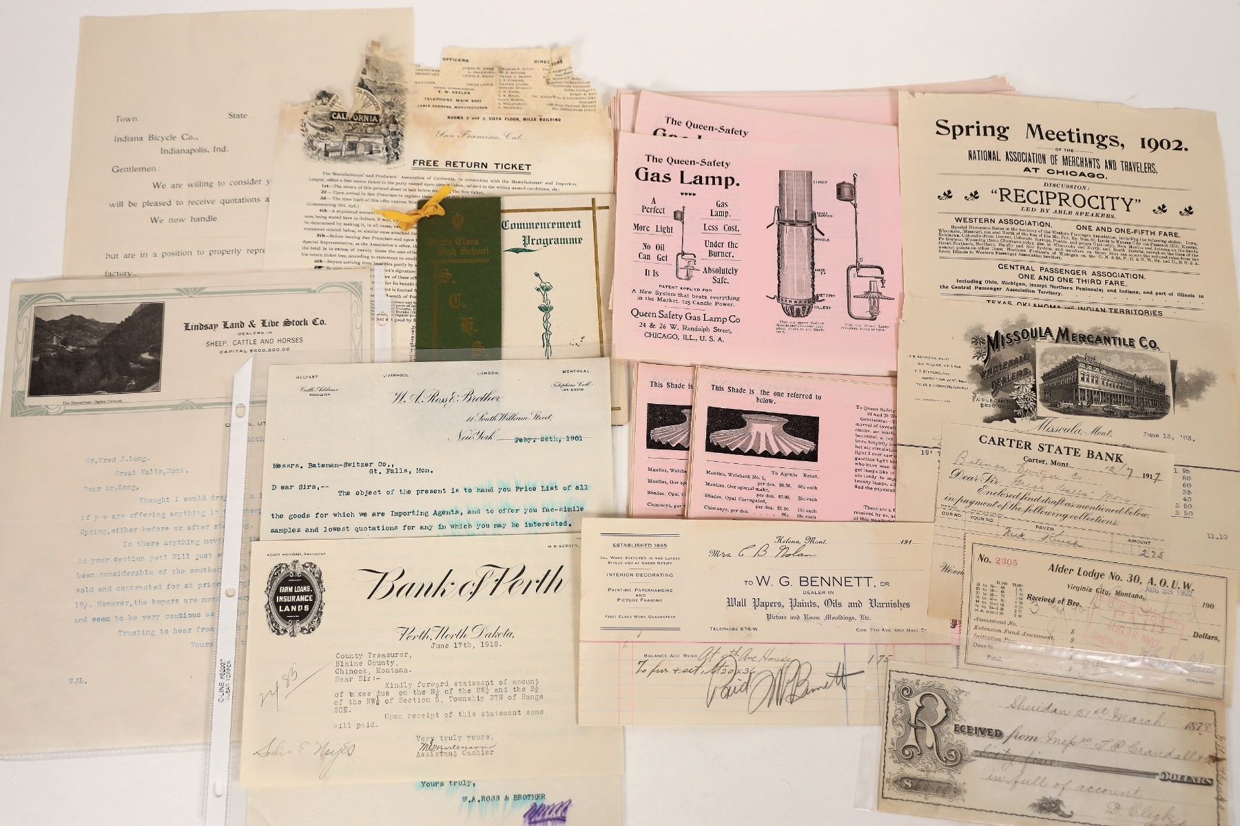 Early advertising and other ephemera, including a commencement program from Santa Clara (Ca.) High School, Class of 1909. Also included are receipts from Carter State Bank of Carter, Montana, a letter from a Utah land & cattle company, several copies of an ad from The Queen Safety Gas Lamp Company and more. All in pretty decent condition. Please see photos for more details.