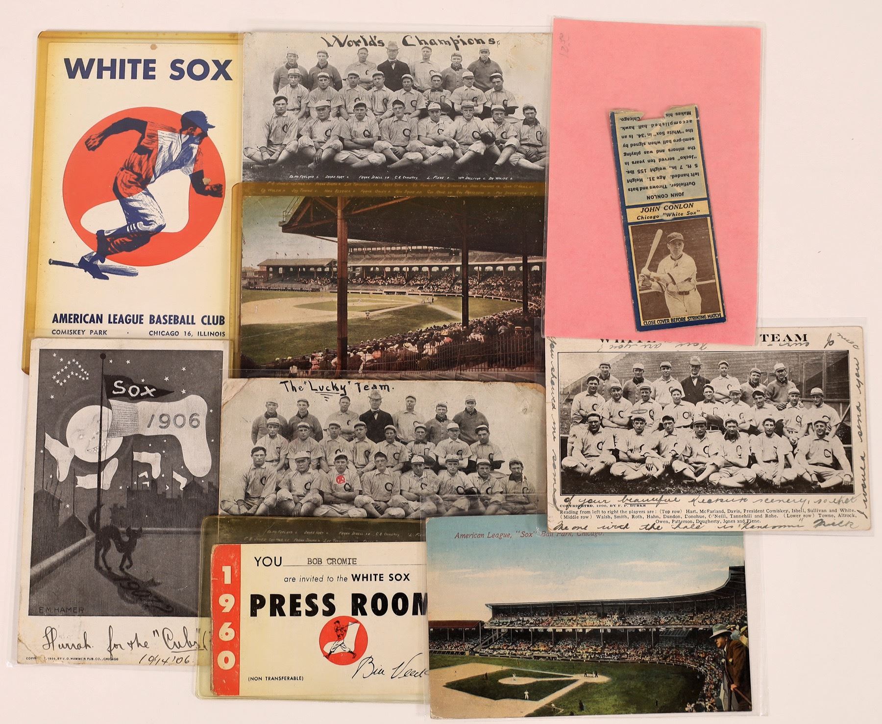 An interesting collection for any Chicago sports fan. Included are RPC's of the 1906 Chicago White Sox, known as "The Lucky Team" and winners of the 1906 World Series in only their sixth year in the league. There's also a press pass, signed by celebrated owner Bill Veck and issued to longtime sportwriter Robert Cromie who passed away in 1999 at the age of 90. All items are in good shape. Please see photos for more details and condition.