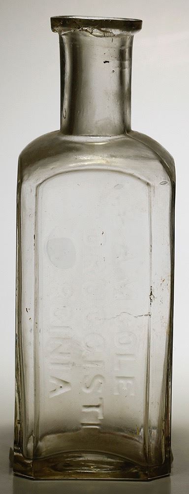 A. M. Cole / Druggist / Virginia // Base, flat and plain. Very early bottle . Variety # 2 . 1863-1865. Flint glass, tooled top, 4 1/2" x 1 5/8' in size.. Great condition, except for a tiny bit of inside shoulder haze. Also, there is a glob of glass, under the lip. It is not a repair or damage. I checked it with a black light !! Minute lip roughness, next to that. A great piece...Plus....a 3/8" bubble behind the letter " V" in " Virginia" HWAC# 59226 Date: Location: Virginia City, Nevada