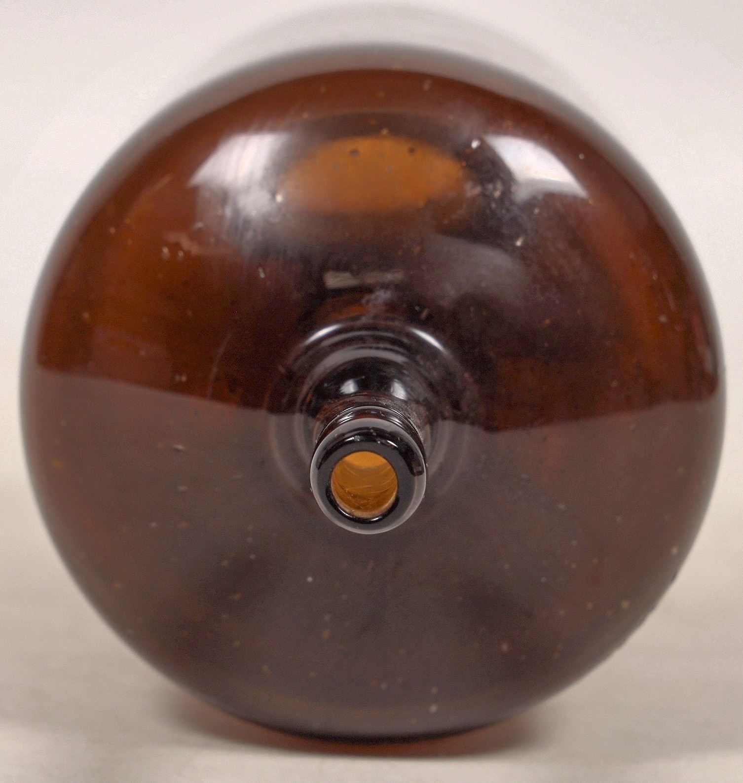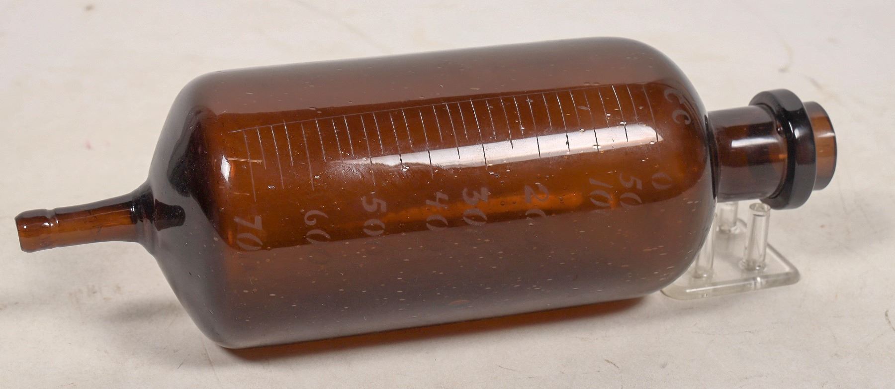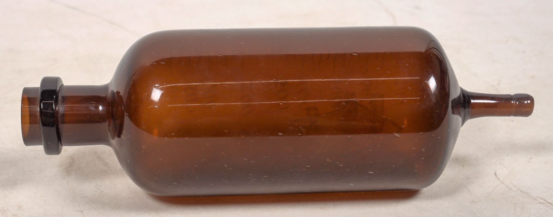Early beautiful amber, hand blown IV bottle dug in the late 1960s in the "hospital dump" below the brick Virginia City hospital, built in the 1870s. We've never seen another like it in all the museums we've visited (fh). Round, 11" tall, with a body of 7" x 3" diameter. Single hand-applied wrap around strip 1/2" below top for suspension, 2" nipple on the bottom for the drip tube. Etched graduations on one side. Lots of bubbles, a beauty. This bottle was on public display for at least 40 years, garnering much comment. With a world-class USA Hospital bottle in citron color as another lot in this sale, it is appropriate to offer this rarity, a true, hospital-used early medical bottle.
