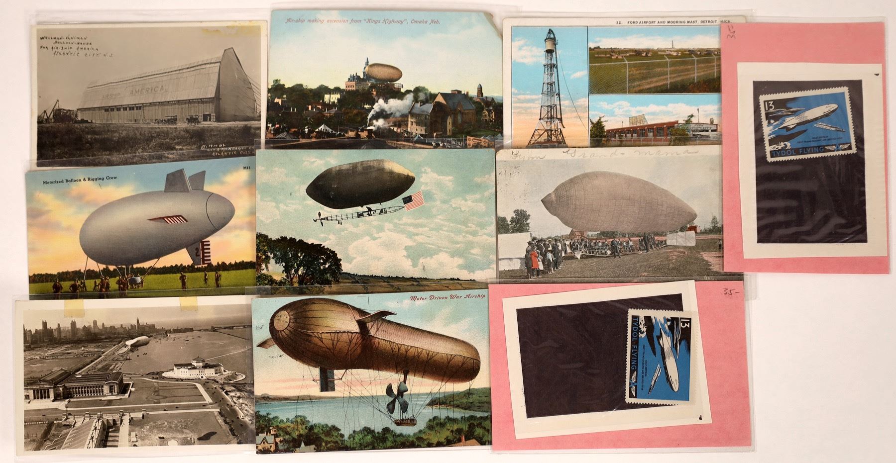 Lot of 10. Four are postmarked w/ stamps (1 cent, one of Statue of Liberty). Two RPC’s (b/w) : blimp offer Grants Park, Chicago and one of the “balloon house” in Atlantic City N.J for Air Ship AMERICA (1910). Two 13 cent uncanceled stamps of the Graf Zeppelin trans-Atlantic flight 1928 by Tyrol Flying “A”. Remainder are different airships around the U.S. Protective sleeves.