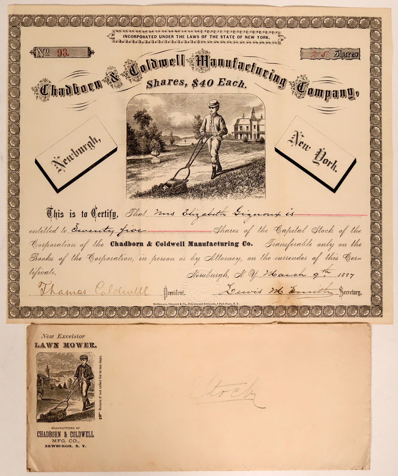 Stock certifcate for Chadborn & Coldwell MAnufacturing Co. issued March 9, 1887 for 25 shares to Eliz. Gignon. Uncancelled, signed by Thos Coldwell as president and Lewis m Smith as secretary. This pair reportedly began inventing and producing new forms of rolling mowers in teh 1870's, a full 40 years after the lawn mowwer was invented by Edward Budding in England in 1830. This stock also comes with the orignal envelope which has the same vignette as the stock.