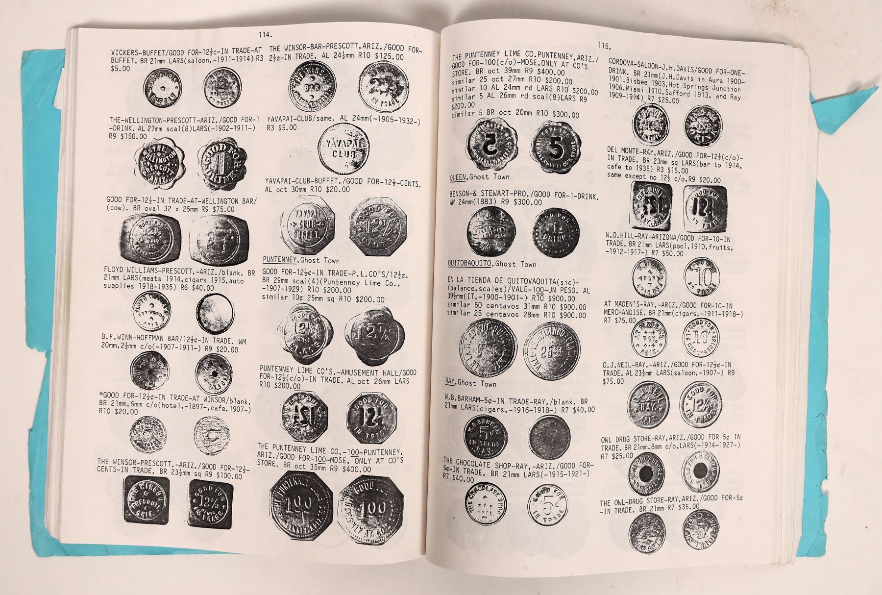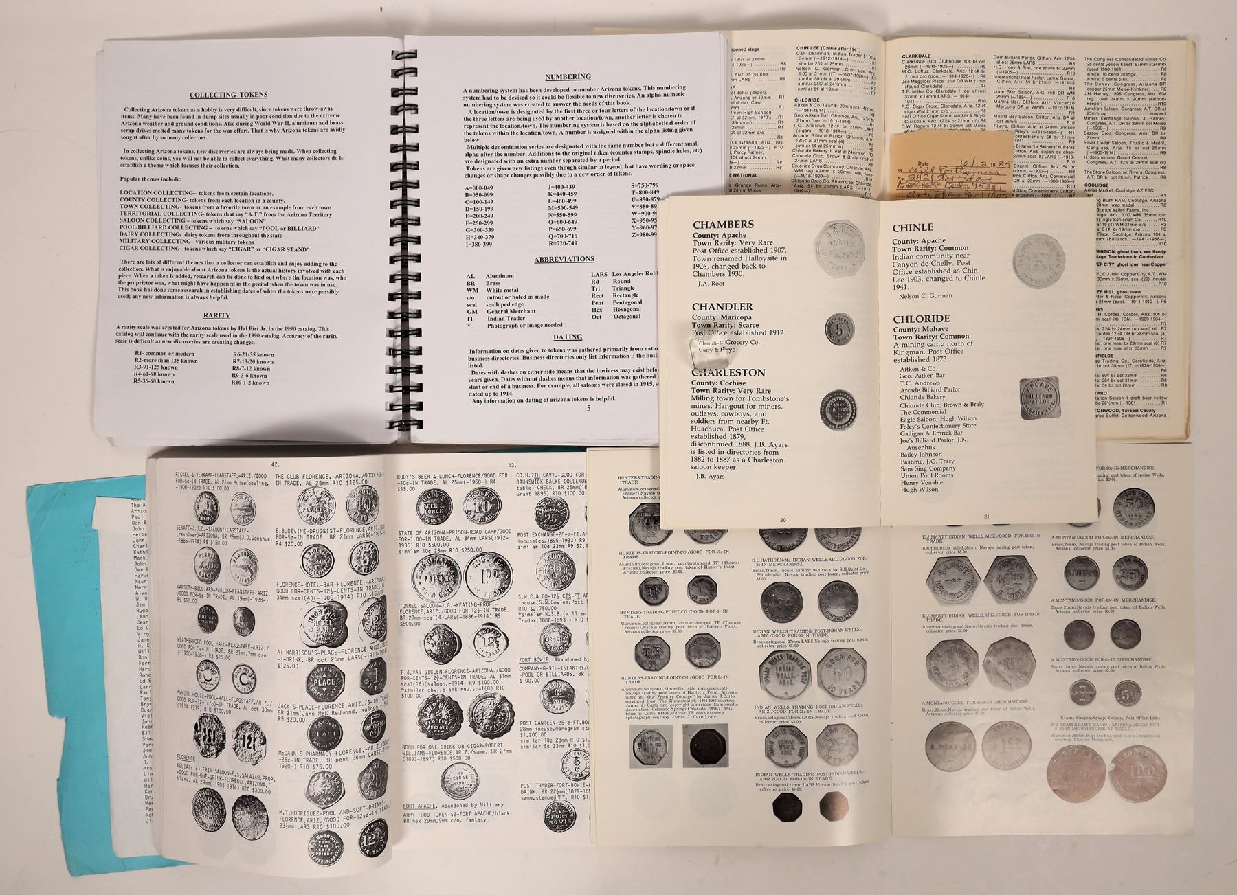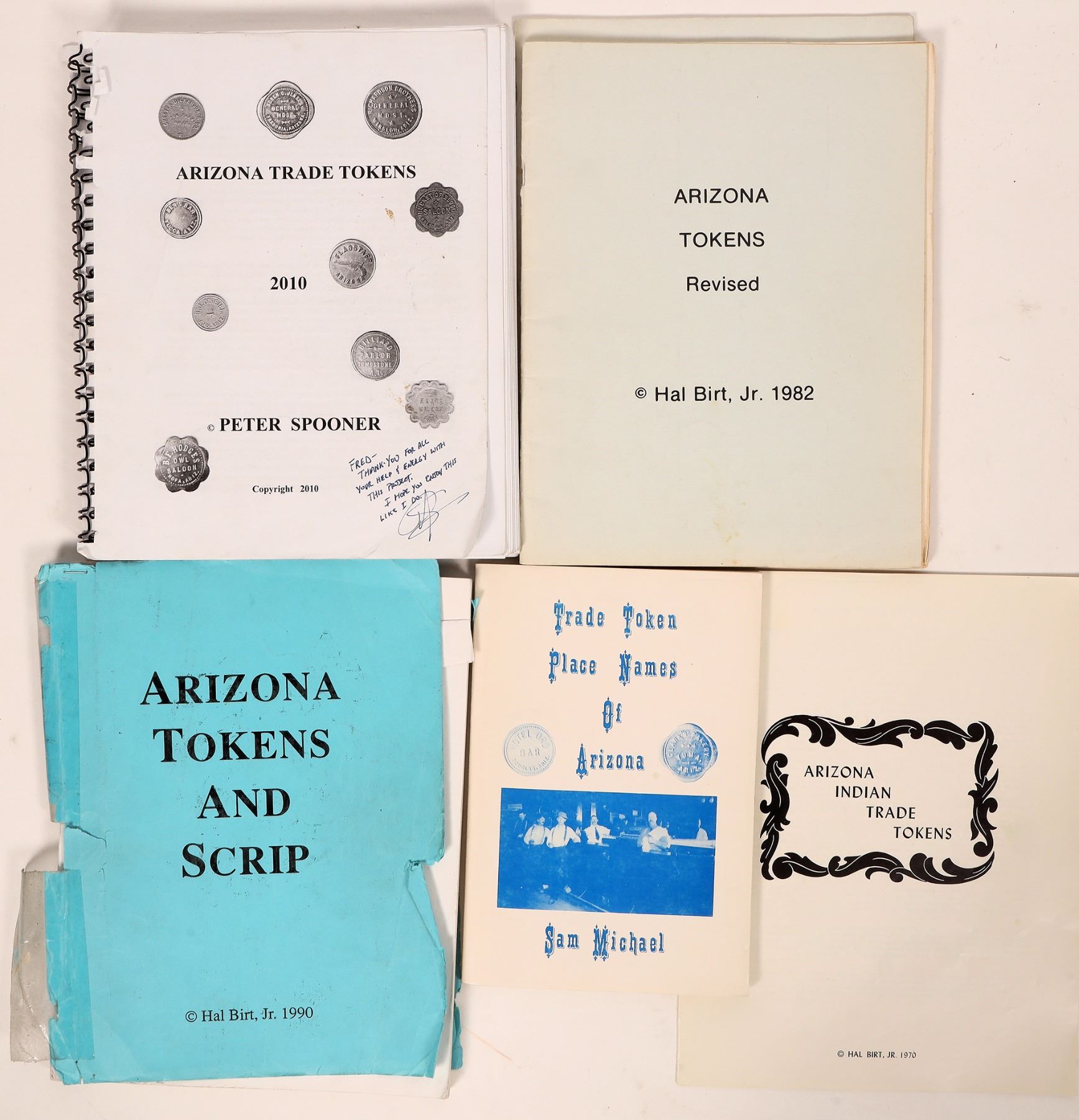 (6) Books on early Arizona Trade Tokens. 1. Two copies of : "Arizona Tokens Revised" by Hal Birt, Jr, 1982. 2. "Arizona Indian Trade Tokens", by Hal Bird, Jr.,1970. ", 3."Trade Token Place Names of Arizona" by Sam Michael, 1986. 4. "Arizona Tokens and Scrip" by Hal Birt, Jr., 1990. 5. "Arizona Trade Tokens" by Peter Spooner 2010.