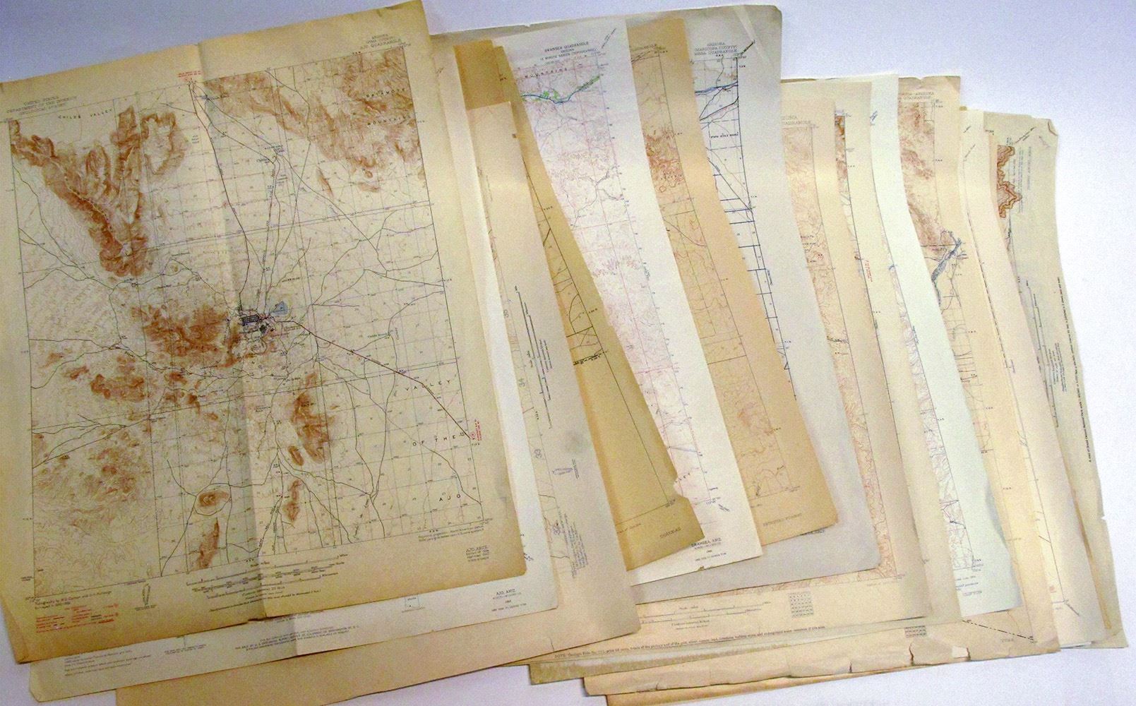 group of 23 early topo maps, mostly from mining regions. About 80% are pre-1920, many from the first survey period of c1895-1912. After about 1915, they standardized the scale to 1:62,500. Great research group, as the old locations are present, all removed from current maps. This group has the Tombstone special and the Ray special. Lawrence Meeker Collection. Date: Location: Arizona HWAC# 57218