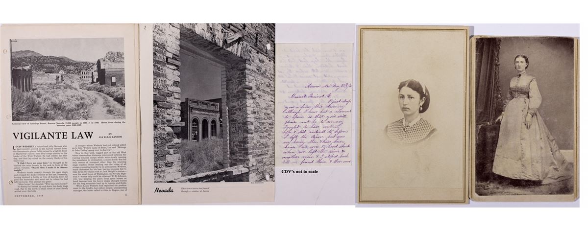 Lot of 5: 1) A blank copy of an Attachment for Defaulting from the District Court, Third Judicial District of Esmeralda County. Other than one fold crease, the document is in excellent condition. 2) A 2.5" x 3.5" CDV of Aurora resident Ada Stewart, taken by local photographer H.K. Gage aroung 1882. Piece is in very good condition. 3) Another CDV, a head shot of unknown woman, also by Gage, taken around the same time. This photo is also in very nice condition. 4) This is a handwritten letter, dated 13 May 1870 and is from H.P. Colby to her friend Miss E.H. Wheeler. An excerpt from the letter reads, "I am well, but tired of the saddle, for I have been in it every day from morning till night." Although showing crease marks from folds, the letter is in very good condition with still sharp lettering. 5) A 1946 article from Nevada Magazine telling about the vigilante justice meted out in Aurora, during the mining days.