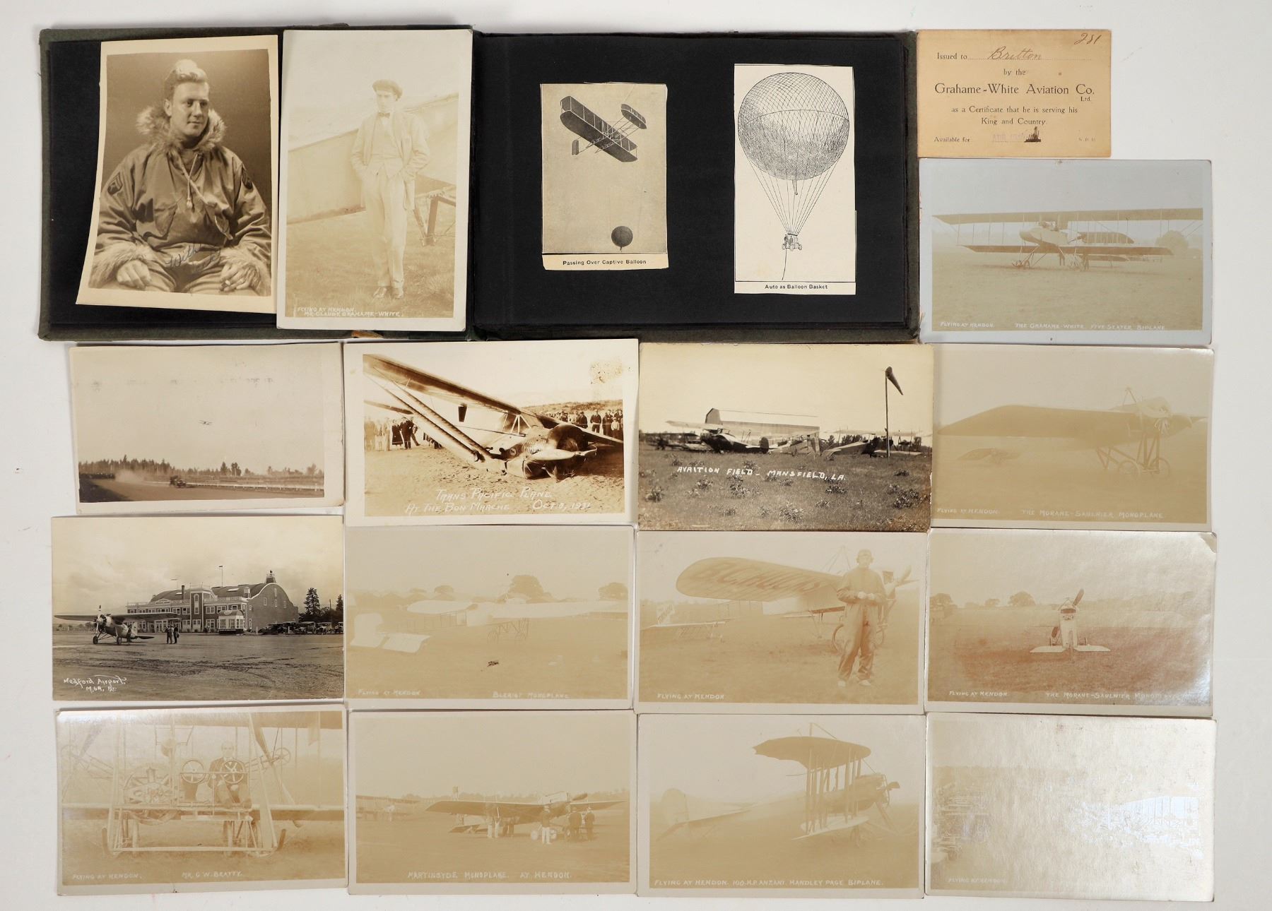 Early aviation collection, scrapbook & postcards. About a dozen postcards, blank, one that's been written and sent. Postcards in good condition. Includes one autographed picture of a pilot with inscription written on the back (likely from the pilot to his mother), good condition. Includes a British certificate card indicating service in the Royal Navy by way of Grahame-White Aviation Co. LTD, self ID of April 1915, good condition with some toning. Scrapbook with about 20 pages, with newspaper clippings pasted on only one side of each page. Pages in good condition, cover in fair condition with an area of foxing about the size of a pressed penny, chipped edges, and some slight buckling/creasing on the covers. Scrapbook measures 8x5.75x.5".