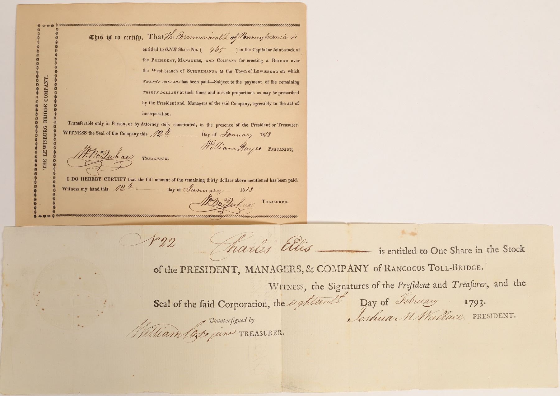 1) Rancocus toll bridge issued February 18, 1793 signed by Joshua M Wallace as president issued to Charles Ellis, certificate number 22. Wallace was a member of the New Jersey convention that ratified the U.S. Constitution in 1787. 2) Bridge over West branch of Susquehanna at the town of Lewisburg issued January 12, 1818. Both in excellent condition, not canceled.