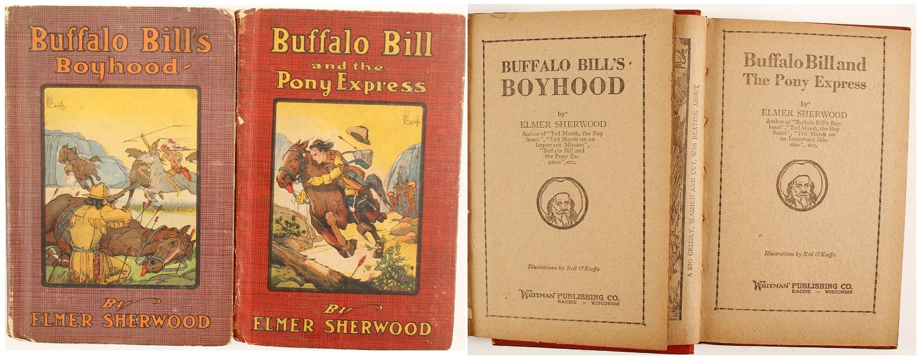 2 early hardcovers. Buffalo Bill's Boyhood 121pp, Buffalo Bill and the Pony Express 124pp. Written by Elmer Sherwood, published by Whitman. 6.75x4.5". Mackie Collection