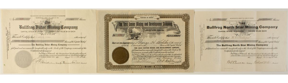 This is a lot of three early pieces from the Bullfrog Mining District, at the front end of the rush. 1) Bullfrog North Star Mining Co., issued to H.Y. Phillips for 5,000 shares on July 11, 1905. It was incorporated under the laws of the state of Arizona. Not cancelled. 2) The Gold Center Mining and Development Co., issued to George H. Koehler for 200 shares on May 5, 1905. It was incorporated under the laws of the territory of Arizona. Not cancelled. 3) Bullfrog Victor Mining Co., stock no. issued to Clarence Edsall for 1,000 shares on May 19, 1906. It was incorporated under the laws of the state of Colorado. Not cancelled. All pieces have some wear including creases and small tears.City: County: NyeState: NVDate: c1905