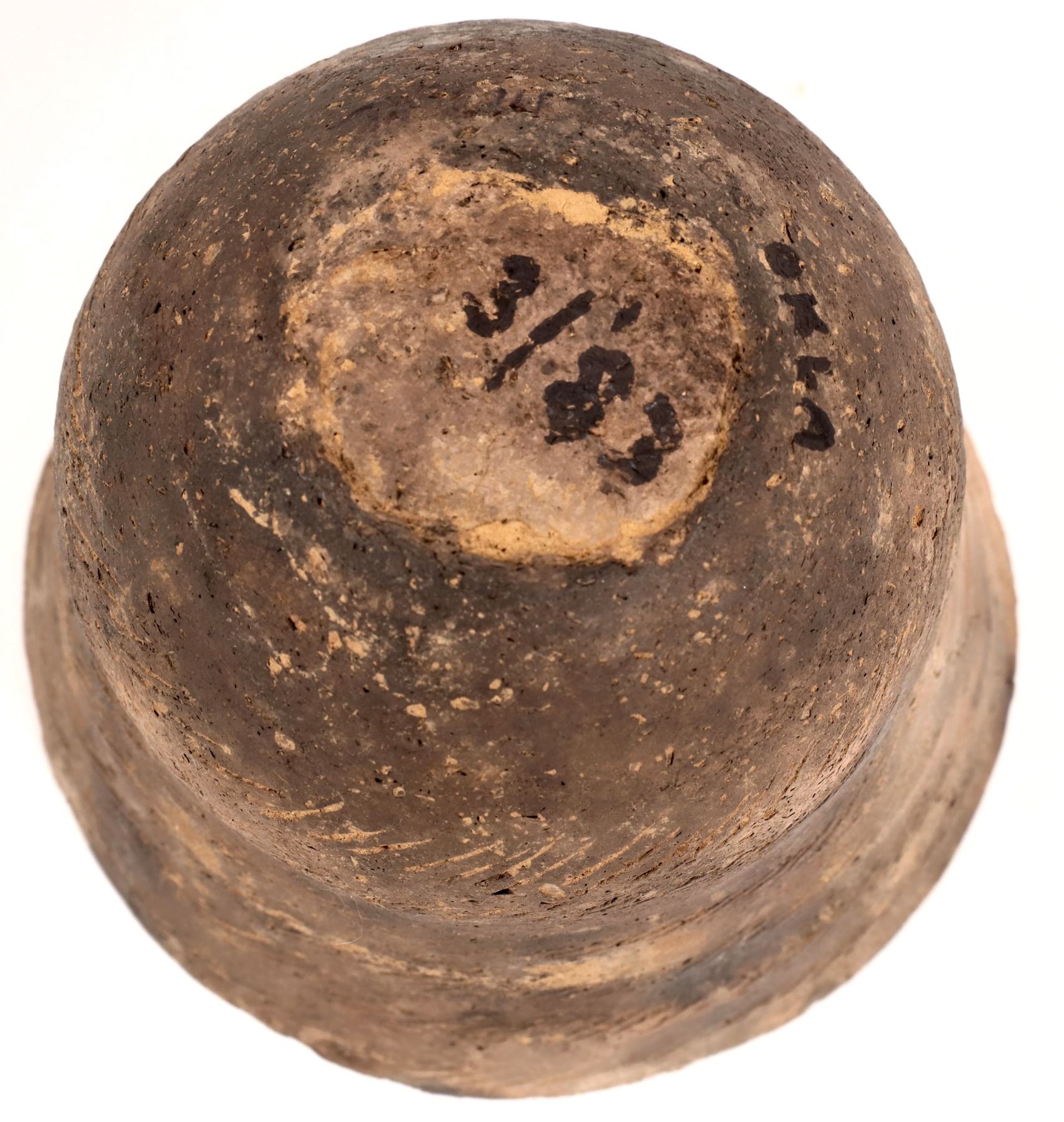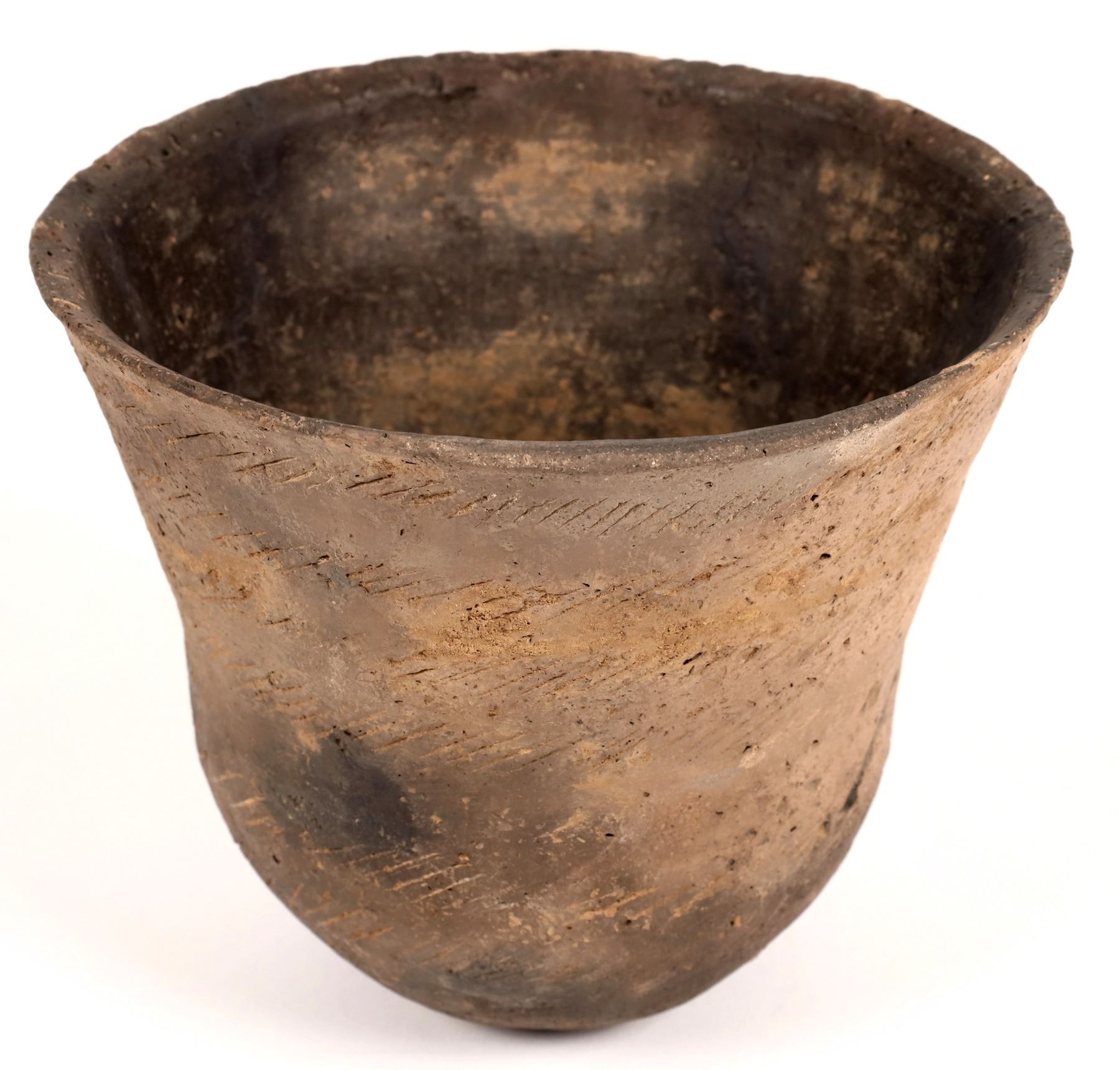 Related to the Mound Builder cultures. Vintage Caddo pot with traditional etched hashmark design. Flared lip. From Arkansas/Texas areas. Dating back to approx. 800 to 1200 A.D. 5"x5.5". A 2.5" side crack. Please inspect