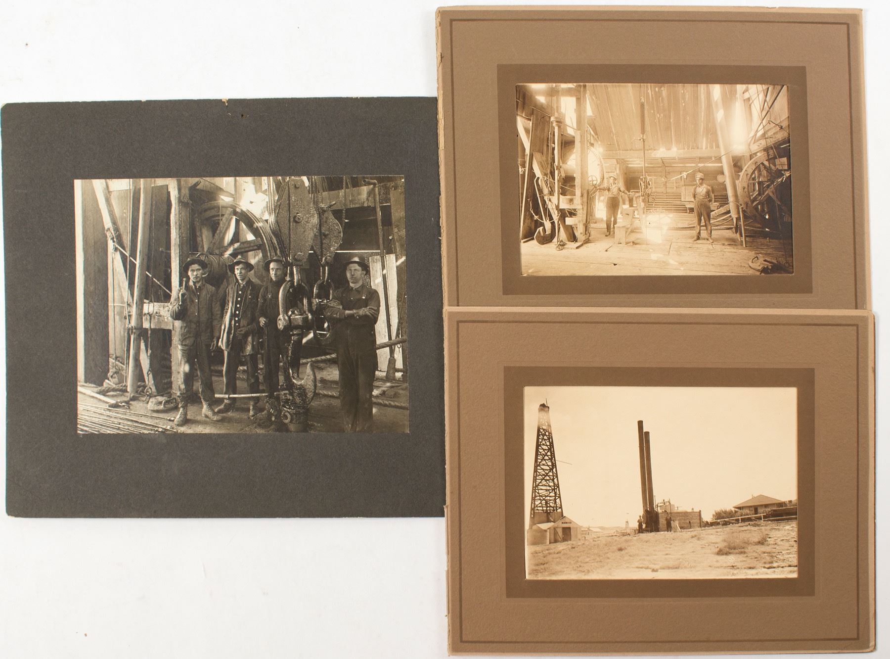 Three choice early mounted photographs, circa 1910 in and during the great oil boom of the first few years of the 20th century. The views are clearly the Kern County area, not the California beach area around Huntington Beach. The first is about 6 x 8" matter to a larger size. It shows a derrick at left and several men next to what appears to be a small refining plant and a houses. The second is an interior shot inside the main floor of a derrick pumping station with 2 men. Same size. The third is about 6 x 8.5"on the inside of a different derrick with 4 men. This is a very important part of California's history, with a new product boom that wasn't gold, silver or copper, but oil!