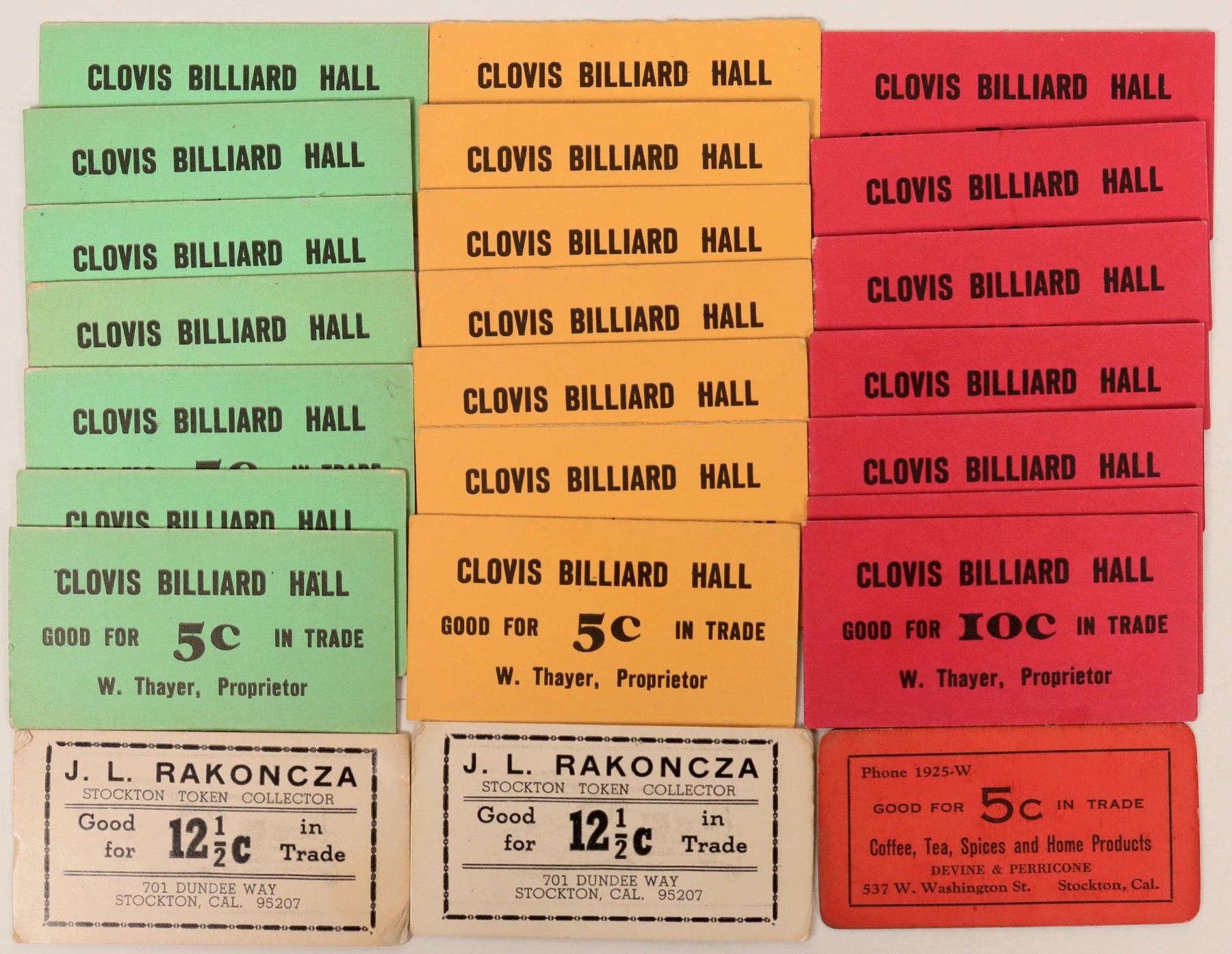 Lot of 24 paper tokens from Central California, includes 21 tokens from Clovis Billiard Hall, W. Thayer, Proprietor, with 14 "good for 5 cents in trade," and seven "good for 10 cents in trade." Plus a paper token from Devine & Perricone, Coffee, Tea, Spices and Home Products, 537 W. Washington St., Stockton, Cal. Phone 1925-W, "good for 5 cents in trade," and two J. L. Rakoncza, Stockton token collector, 701 Dundee Way, Stockton, Cal. 95207, "good for 12 1/2 cents in trade." Paper tokens measure approx. 1-1/4 x 2-1/2 inches.