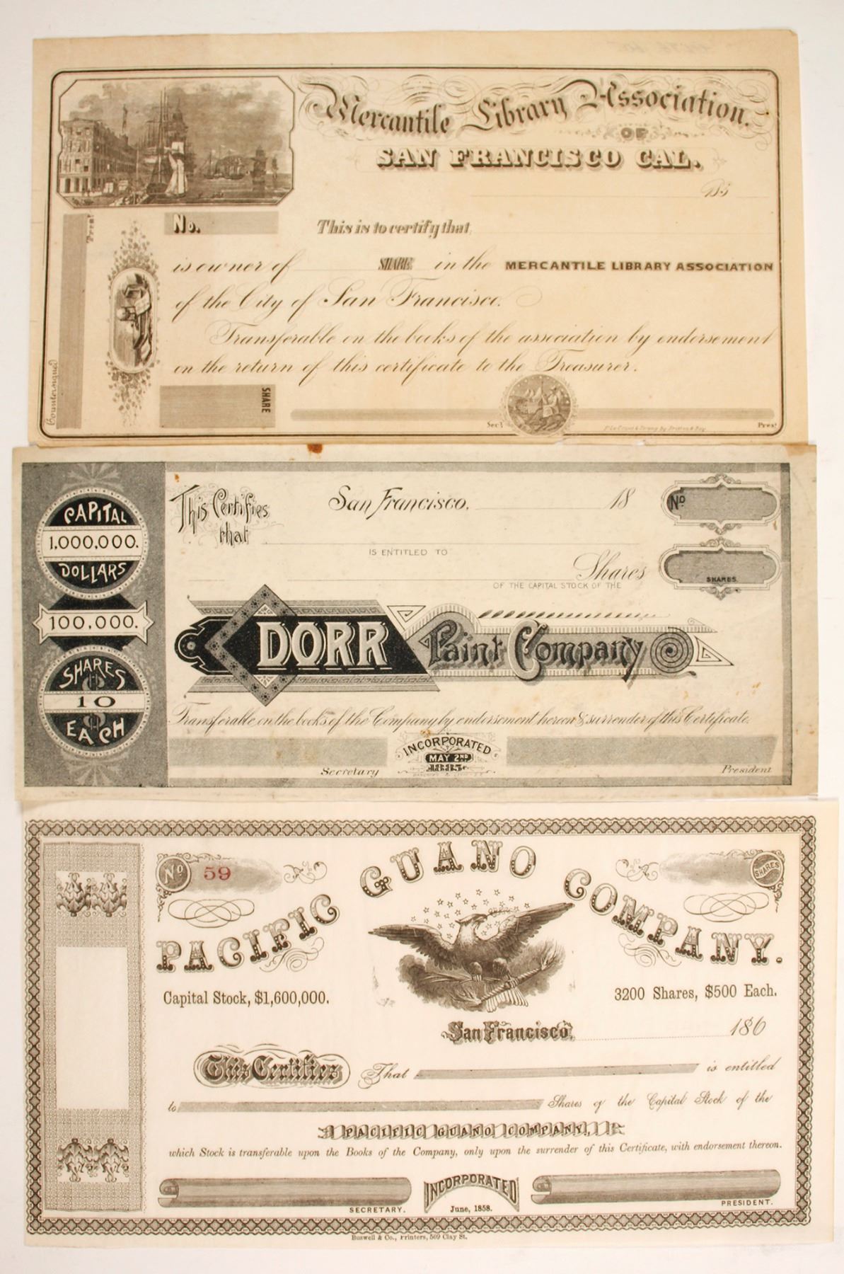 All unissued. 1) Mercantile Library Association. 185-. 2) Pacific Guano Company. 186-. 3) Dorr paint Company. 18--. San Francisco California Ken Prag Collection