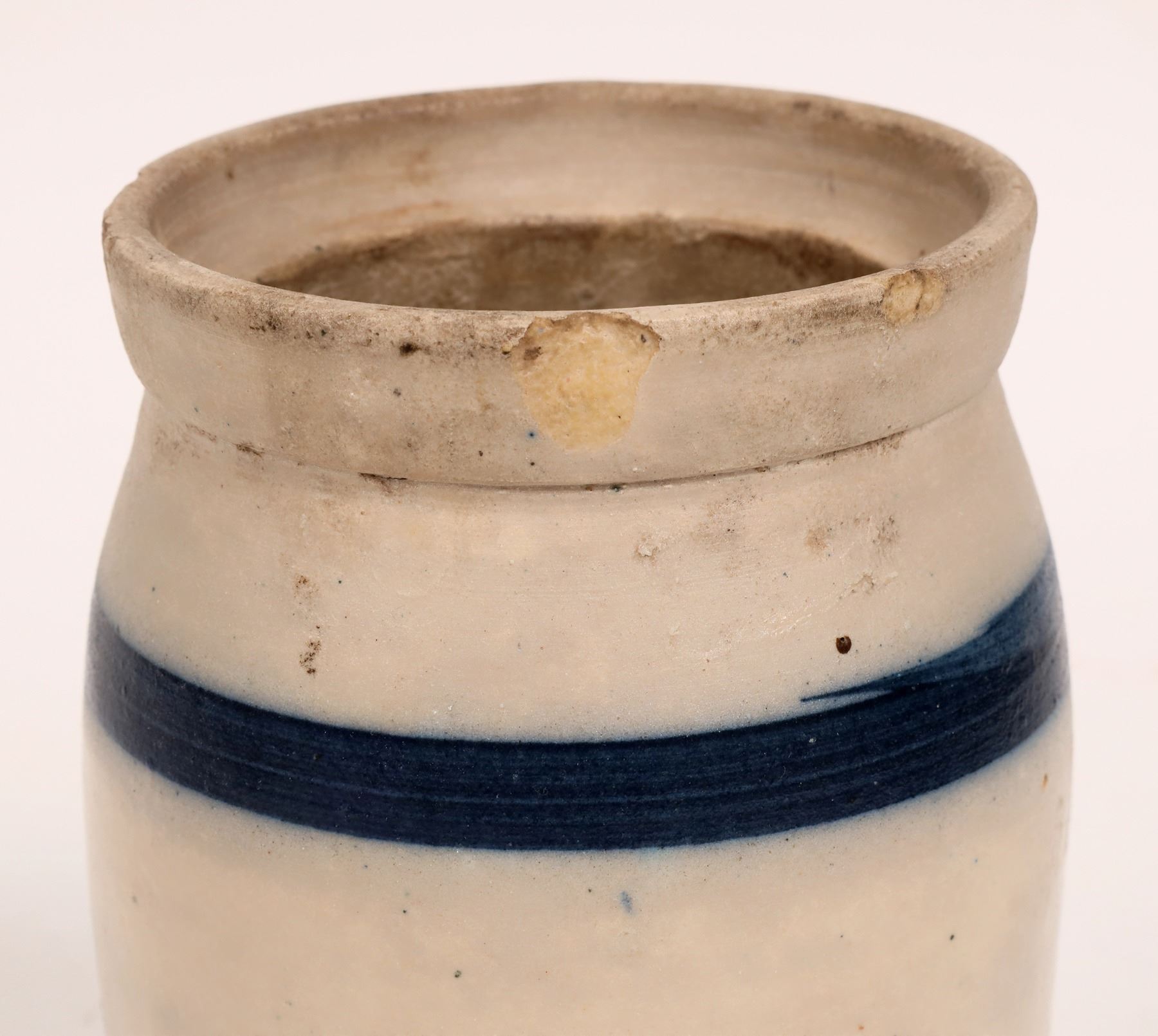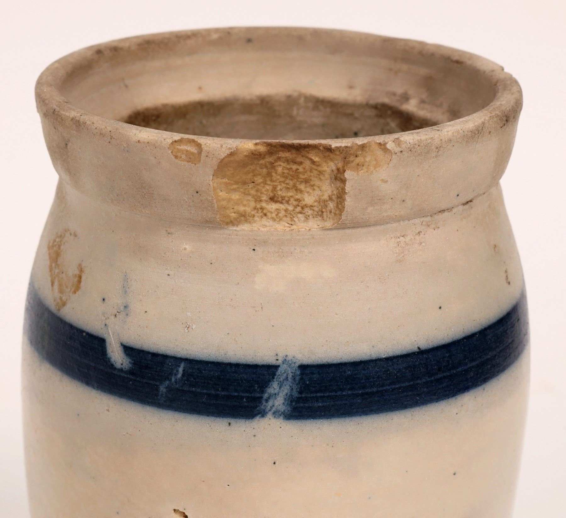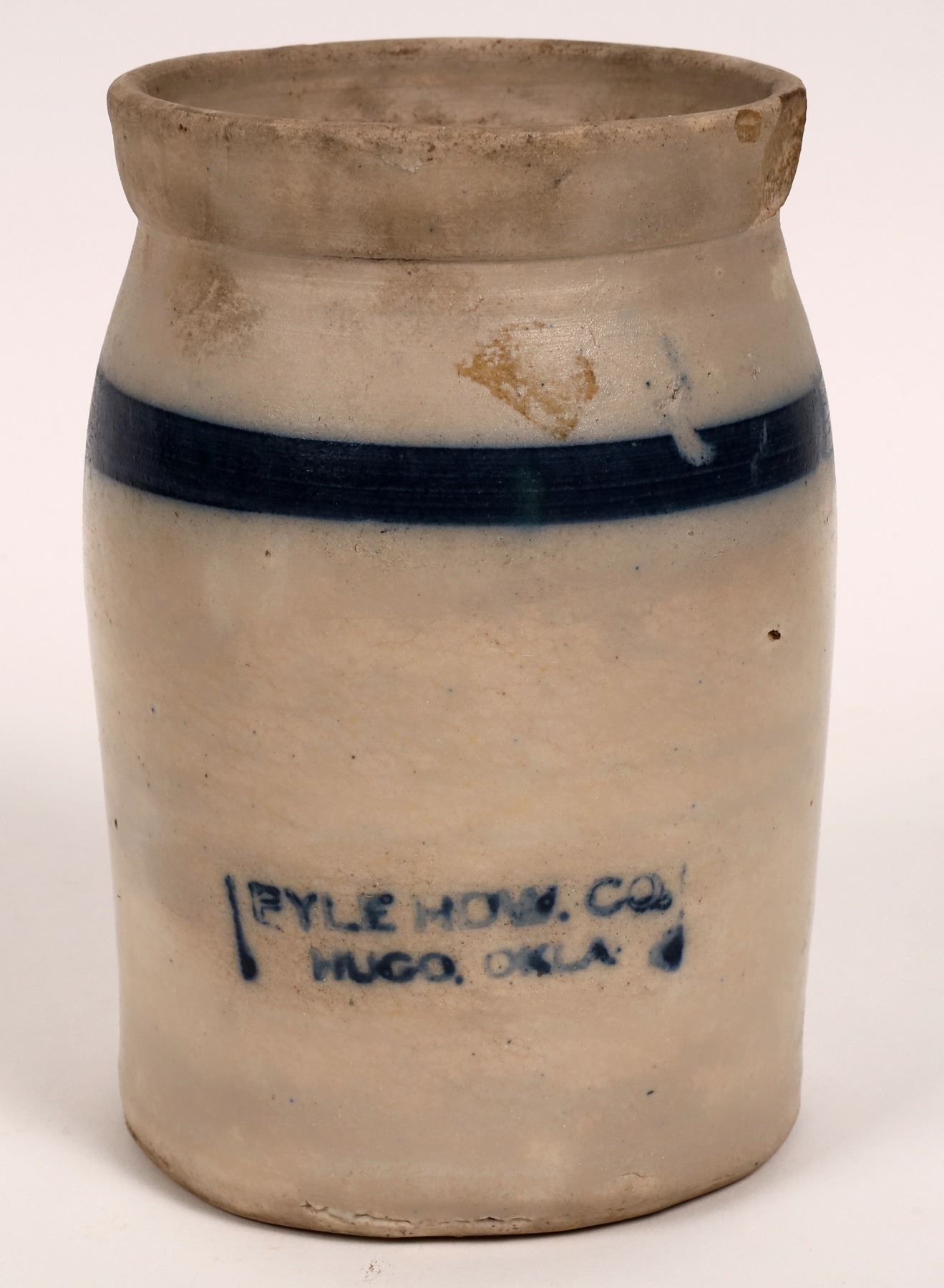 Early canning jar without a lid. Pyle How. Co./Hugo, Okla. Blue band, 6.25x4.25".5 and1" lip chips.