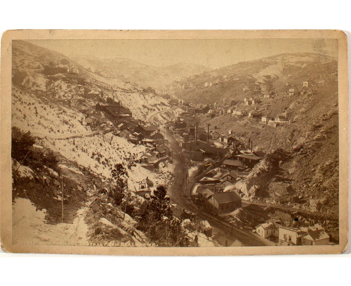 Taken from Black Hawk. One can truly see the relationship of a mine to its city in this view. There are residences and business to the bottom, top, and right of this mine. There are no buildings to the left, that is reserved for the mountain. Central City, at this point, was truly a one road town in the steep valley, Buildings can be seen o the hillside once the canyon is cleared. Great historic photo! 7 x 4 1/2". Nice photo. One small black mark and one small scratch.
