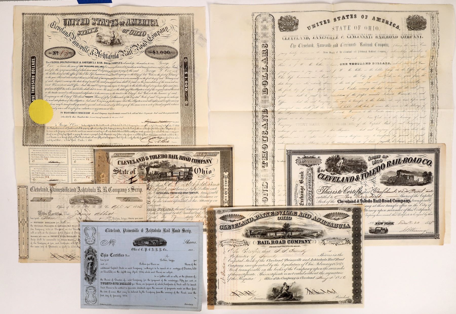 Lot of 7 different. Included: Cleveland & Toledo Rail-Road Company (two different, 1854 stock and 1859 stock); Cleveland, Zanesville & Cincinnati Railroad Company (1853 $1,000 bond); and Cleveland, Painsville & Ashtabula Railroad Company (1850 $1,000 bond, 1856 stock, and two pieces of Scrip, 1856 and unissued). Please inspect.
