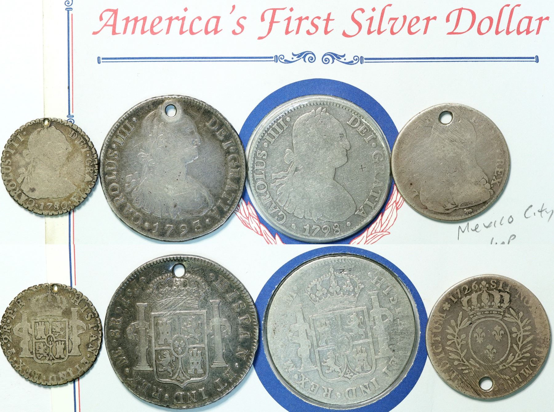 Lot of four interesting pieces: 1726 holed silver piece; 1780 Bolivia 2 reales, worn but readable; 1793 holed 8 reales; and in a presentation case from the Postal Commemorative Society a 1798 Pillar Dollar, 8 reales, with chop marks, and a three paragraph description of the history of America adopting the dollar.