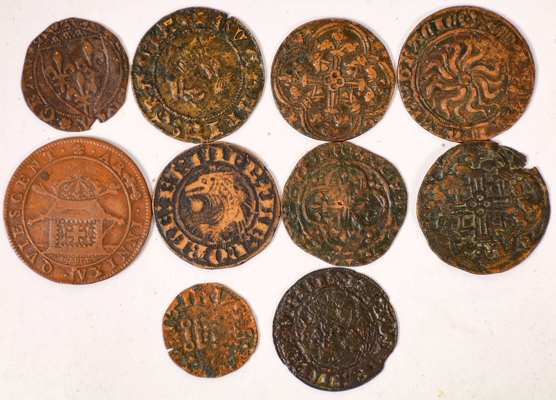 Lot of ten early counters, possibly 1500s English? Medieval crosses on some.