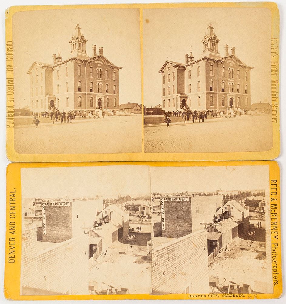 2 early Denver stereoviews. A candy and vinegar factory by Reed & McKenny c. 1870-1872. School House #1 by Collier. HWAC# 53249 Date: Location: Denver, Colorado