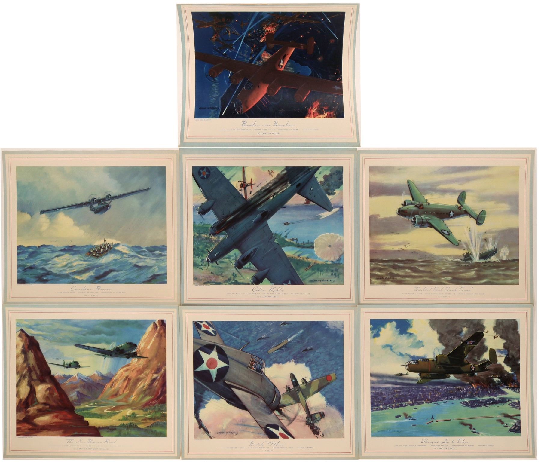 In original presentation wrap includes 7 of the original 12 prints reprinted from a calendar for 1943. 14"x 16.5" without frame. Commemorating Heroic Exploits of American Pilots and Planes Closely Following the United States Declaration of War. Appear in good condition.